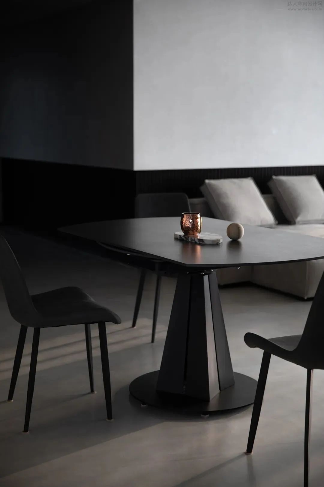粗糙的黑色橡木好似有種收斂各種情緒的魔力,甚至連自然的光線照射在它身上也沒(méi)有了蹤影。時(shí)而細(xì)膩時(shí)而粗獷的紋理,沒(méi)有任何的規(guī)則可言,也給了居者更多的遐想空間。