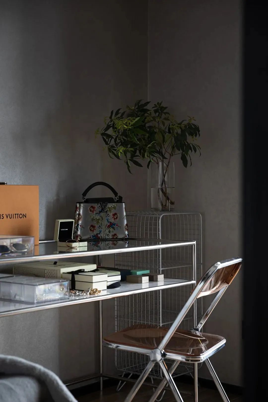 The transition of introverted advanced ash to wooden tea table and metal seat, go from quiet cement wall to the science and technology seat that suits ergonomic study, such novel collocation often can produce wonderful effect.
