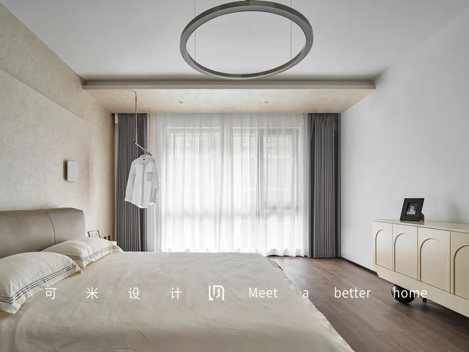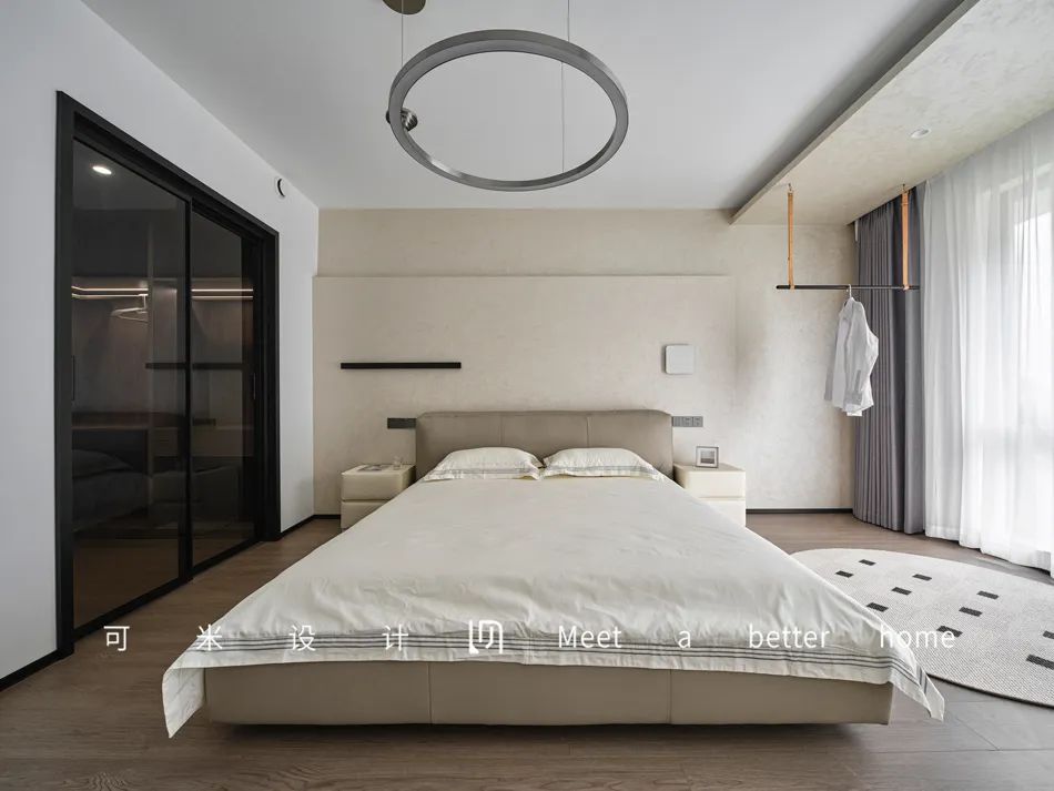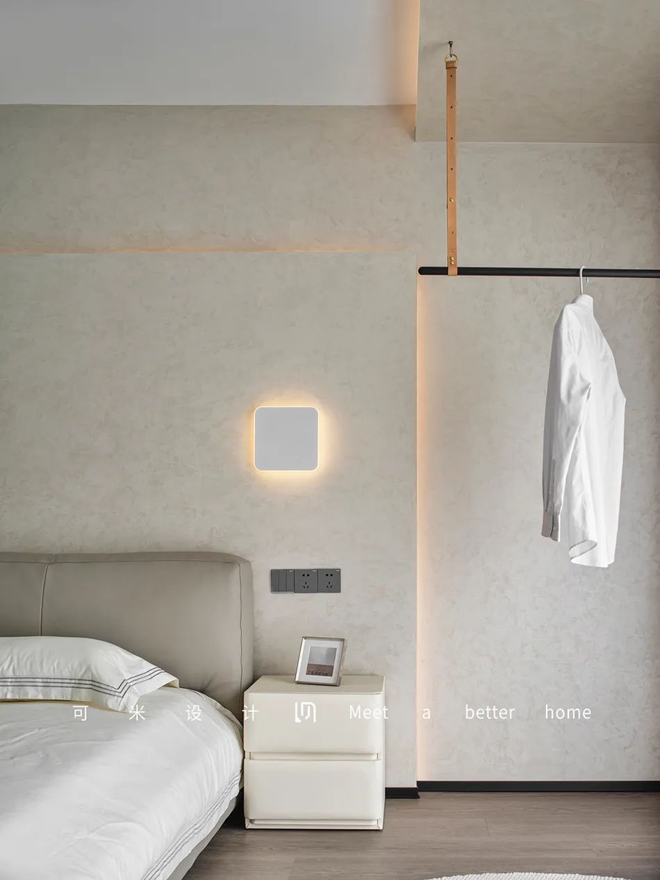 主臥延續(xù)了簡(jiǎn)約的風(fēng)格,通過(guò)改造,隔出一間獨(dú)立的衣帽間,通過(guò)透明玻璃移門增加臥室與衣帽間的通透性。床頭背景墻采用藝術(shù)涂料作為裝飾,為墻面帶來(lái)豐富的肌理效果,摸起來(lái)手感細(xì)膩,提升顏值的同時(shí)也帶來(lái)了藝術(shù)美感;一抹暖色與清爽的白色形成撞色,增添了墻面的層次感,也為空間注入一絲暖意。