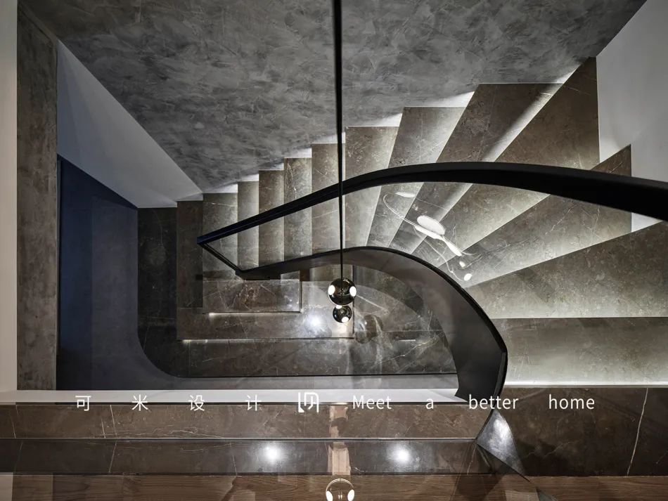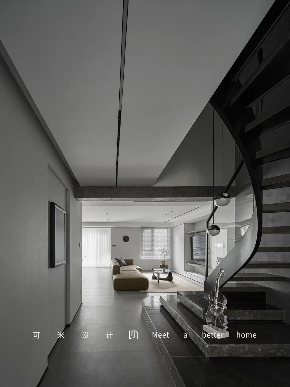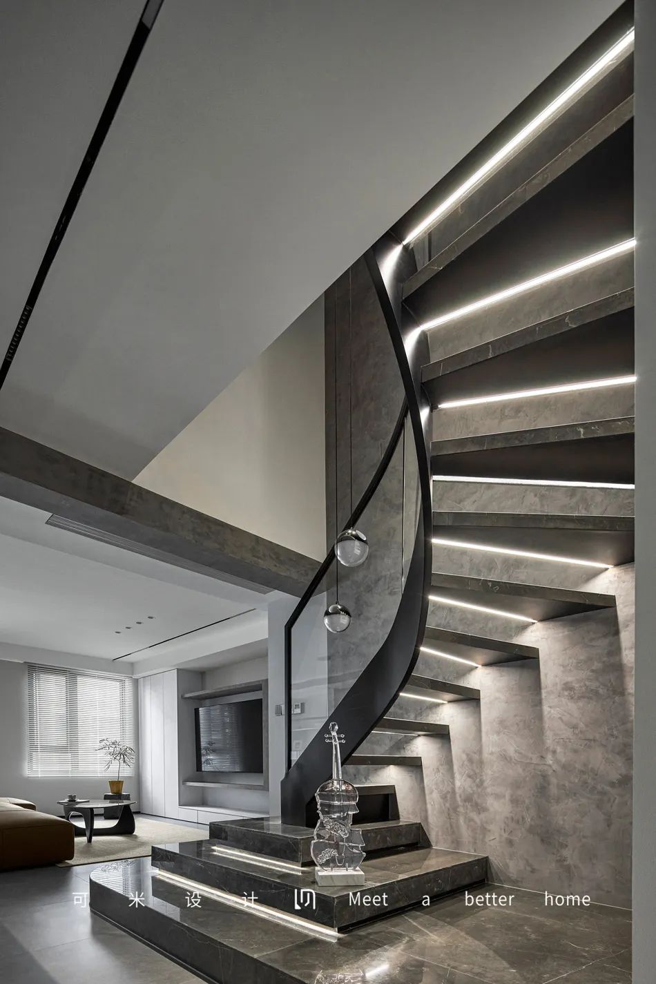 樓梯位置沿著入戶的側(cè)墻設(shè)置,讓客餐廳的布局更加合理舒適,人的視覺和行動(dòng)都有了緩沖。半旋轉(zhuǎn)式的樓梯,搭配運(yùn)用石材、玻璃、鋼架,線條利落、簡(jiǎn)約大氣。