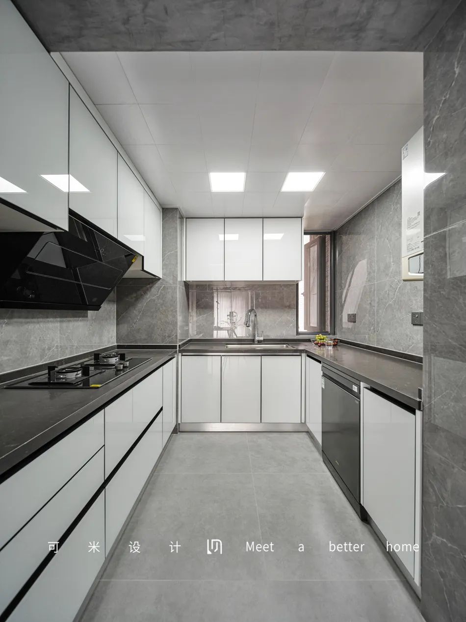 以灰色墻地面作為基礎(chǔ),深灰色石英石作為臺(tái)面,整體櫥柜定制超白玻璃柜門,方便日常清潔打掃,在簡(jiǎn)約的基礎(chǔ)上營(yíng)造出空間的光澤感,整體更加明亮、整潔。