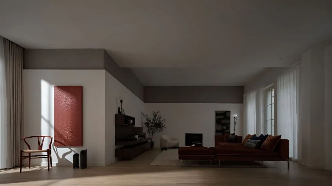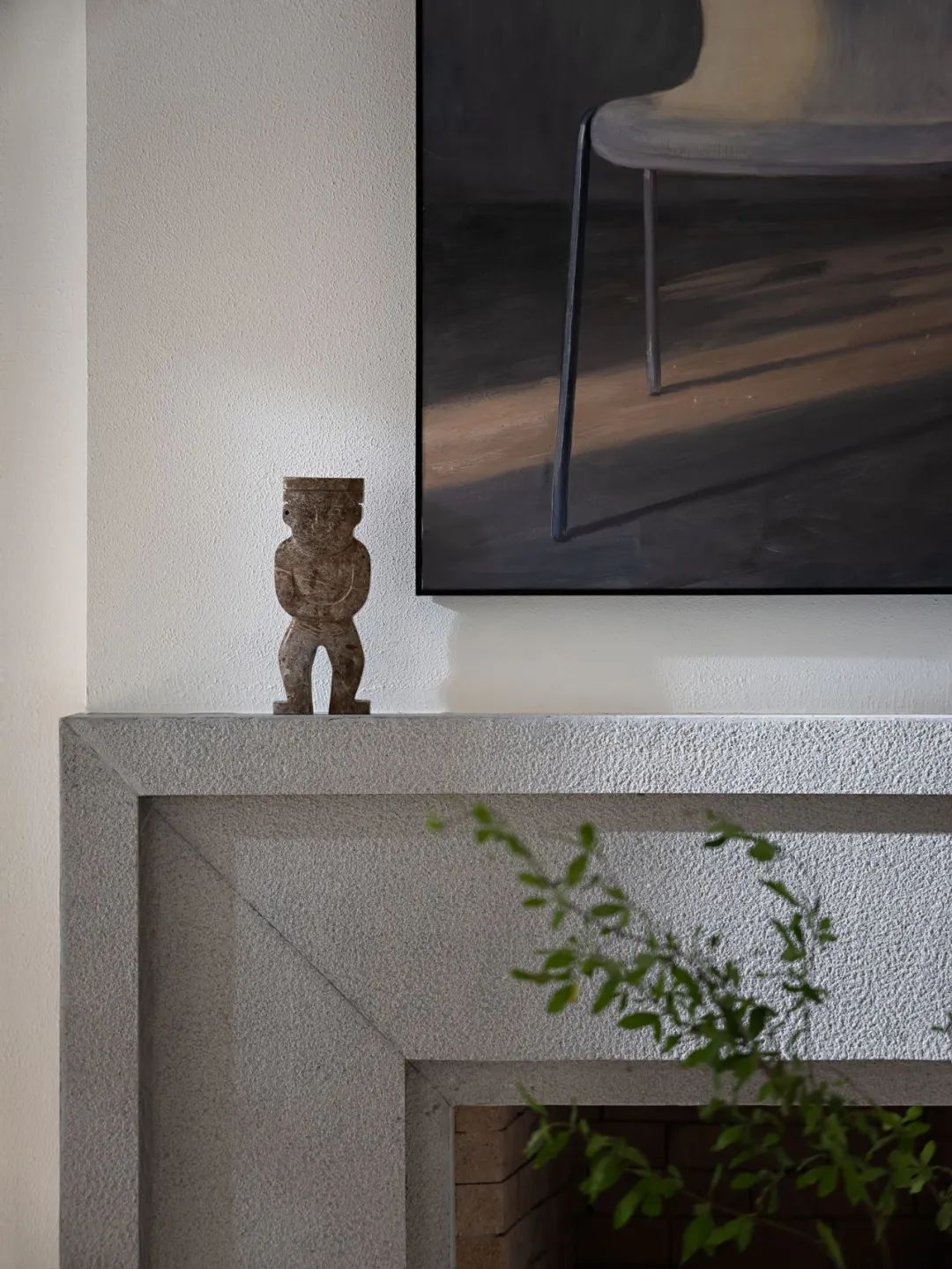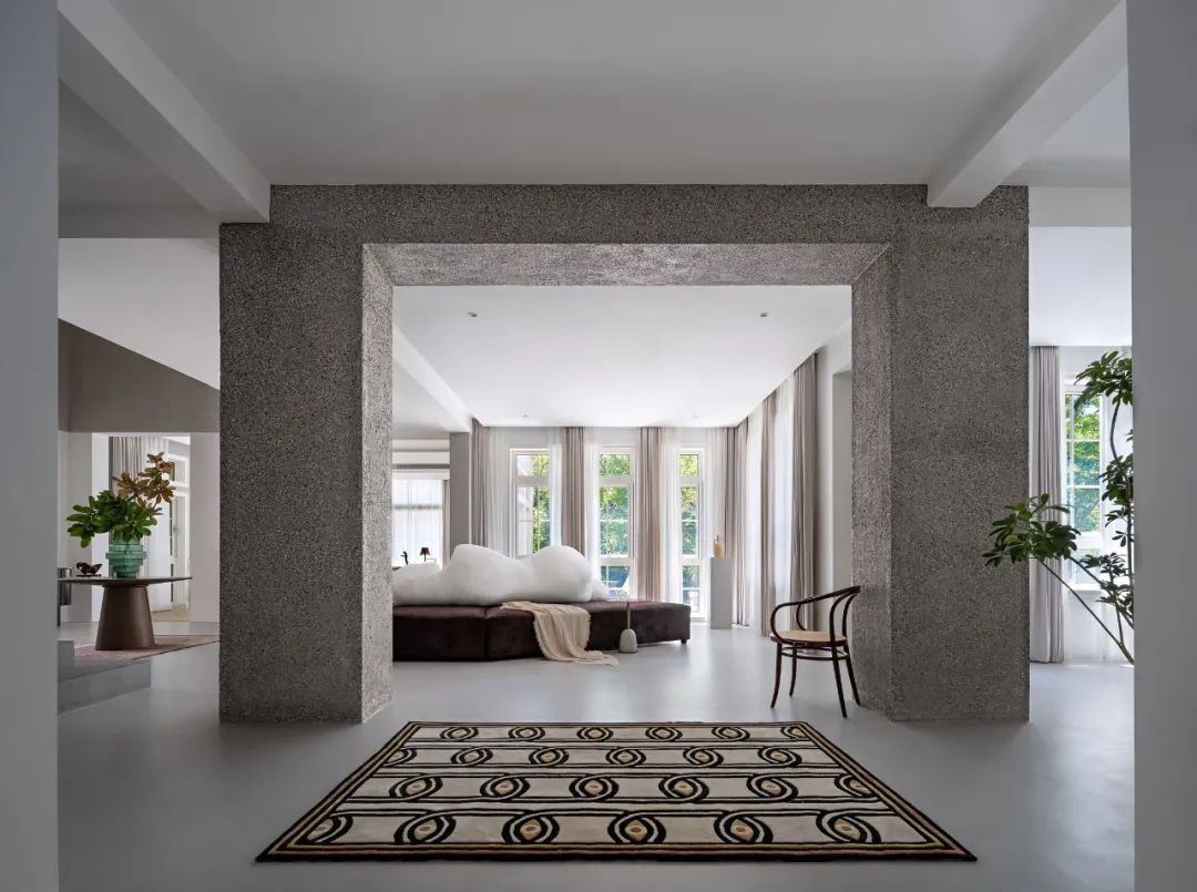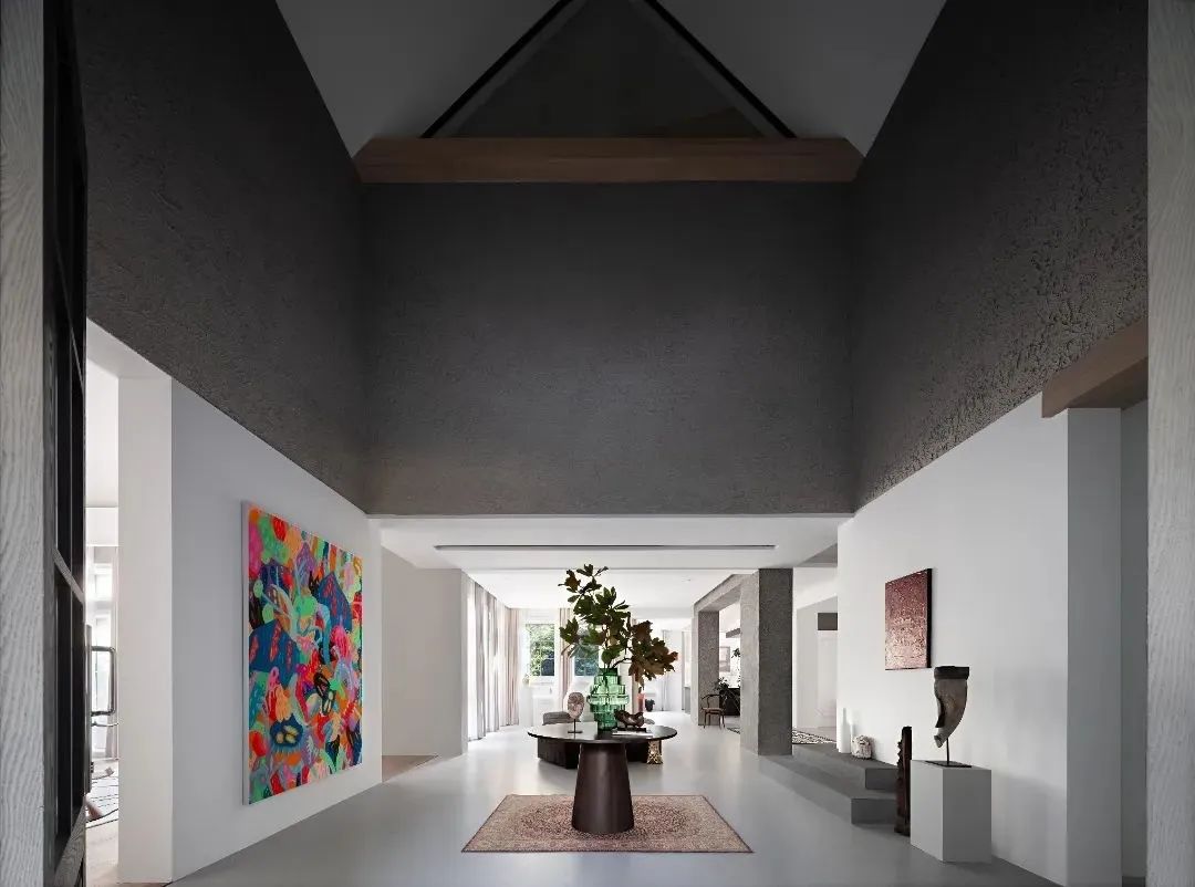 沖突之中,下層白色平滑飾面如畫廊般精致,上層暖灰色的拉毛肌理則凸顯出藝術(shù)質(zhì)感。