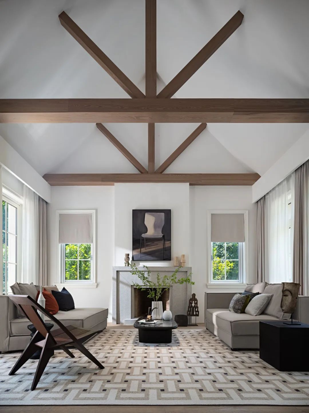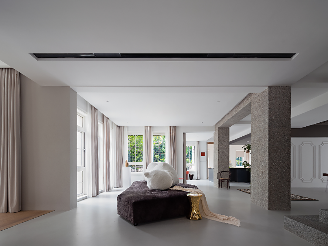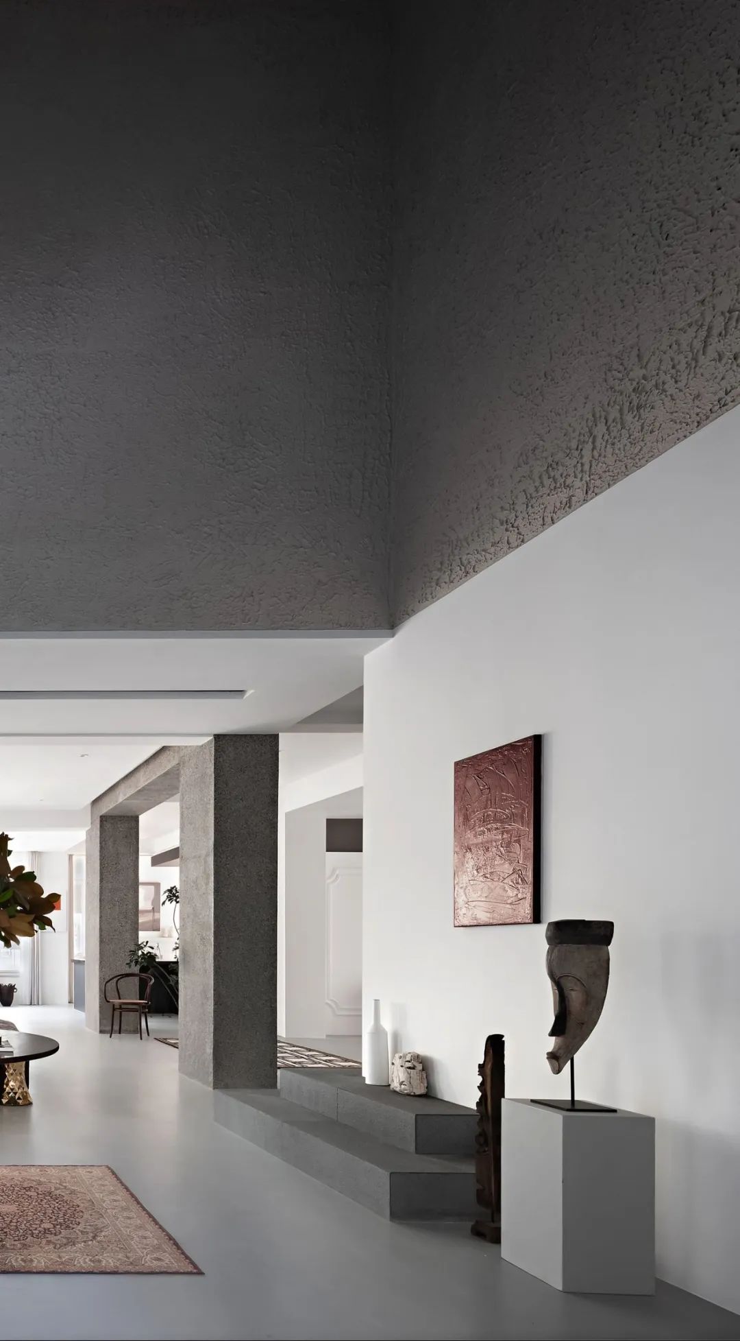沖突之中,下層白色平滑飾面如畫廊般精致,上層暖灰色的拉毛肌理則凸顯出藝術(shù)質(zhì)感。
