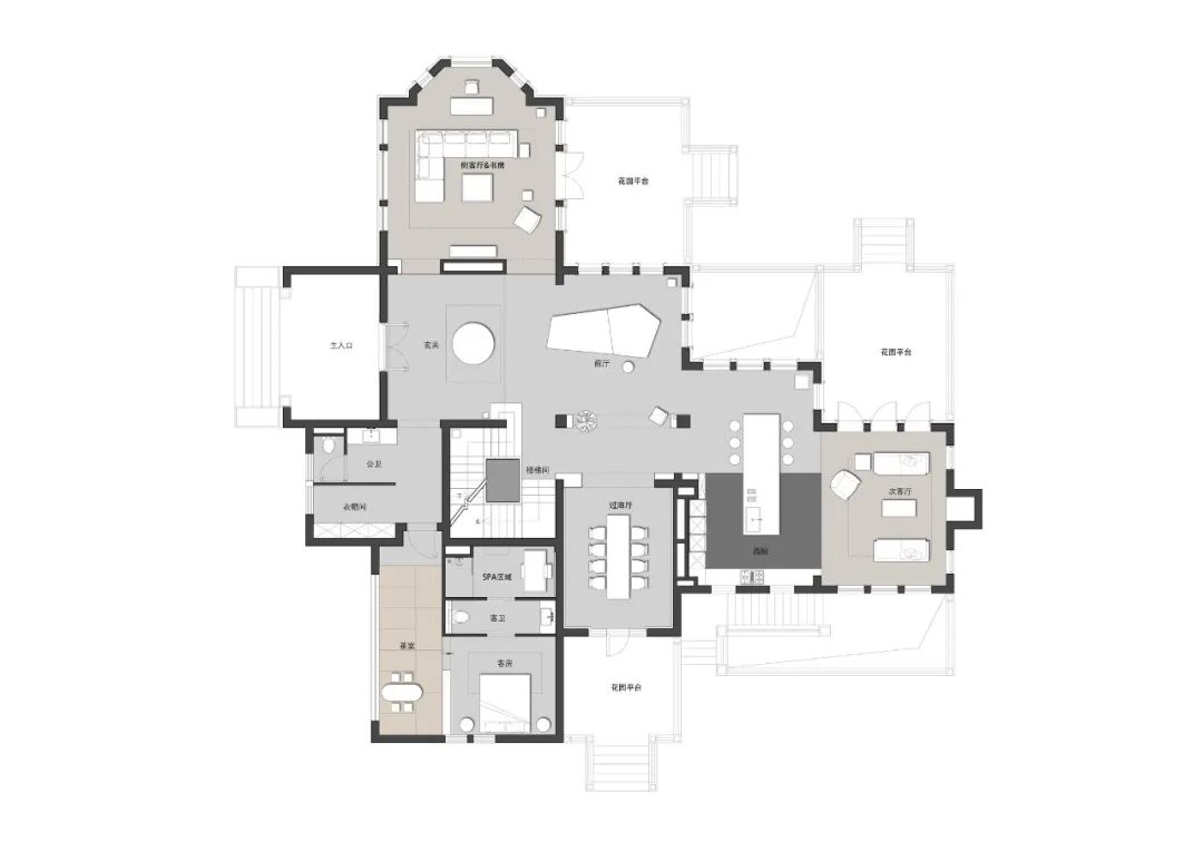 次客廳正面保留了原建筑壁爐,并選用淺灰色小荔枝面花崗巖套嵌。側(cè)廳沙發(fā)不僅與壁爐形成對(duì)話,也與開放式西廚形成相互滲透的交流態(tài)。實(shí)際上,前廳也因與之類似的延伸態(tài)勢(shì)而獲得空間張力。