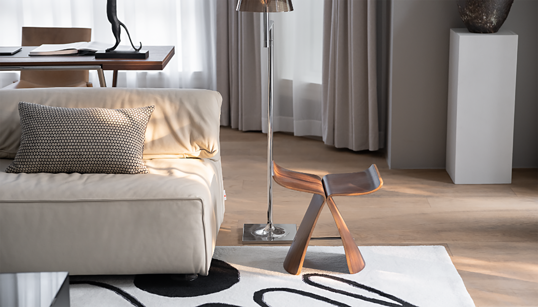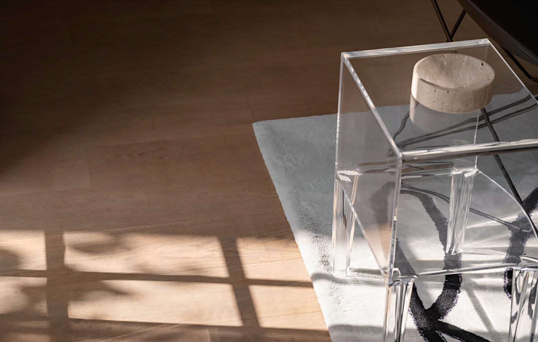 明亮鎏光,動(dòng)靜有致。暖色橡木地板來自全球高端原木地板品牌——Der·1863。表面采用煙熏工藝對(duì)地板進(jìn)行雕琢,呈現(xiàn)真實(shí)的原木印痕與細(xì)膩的觸感。