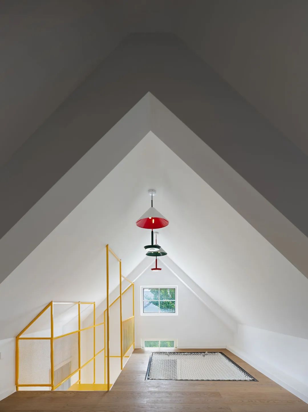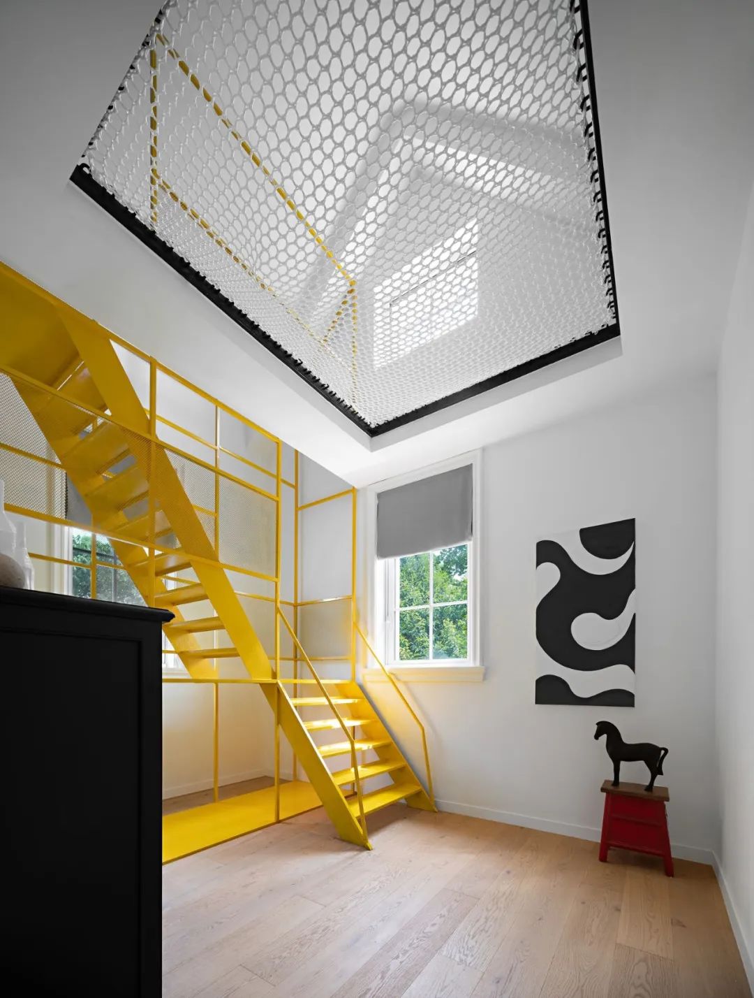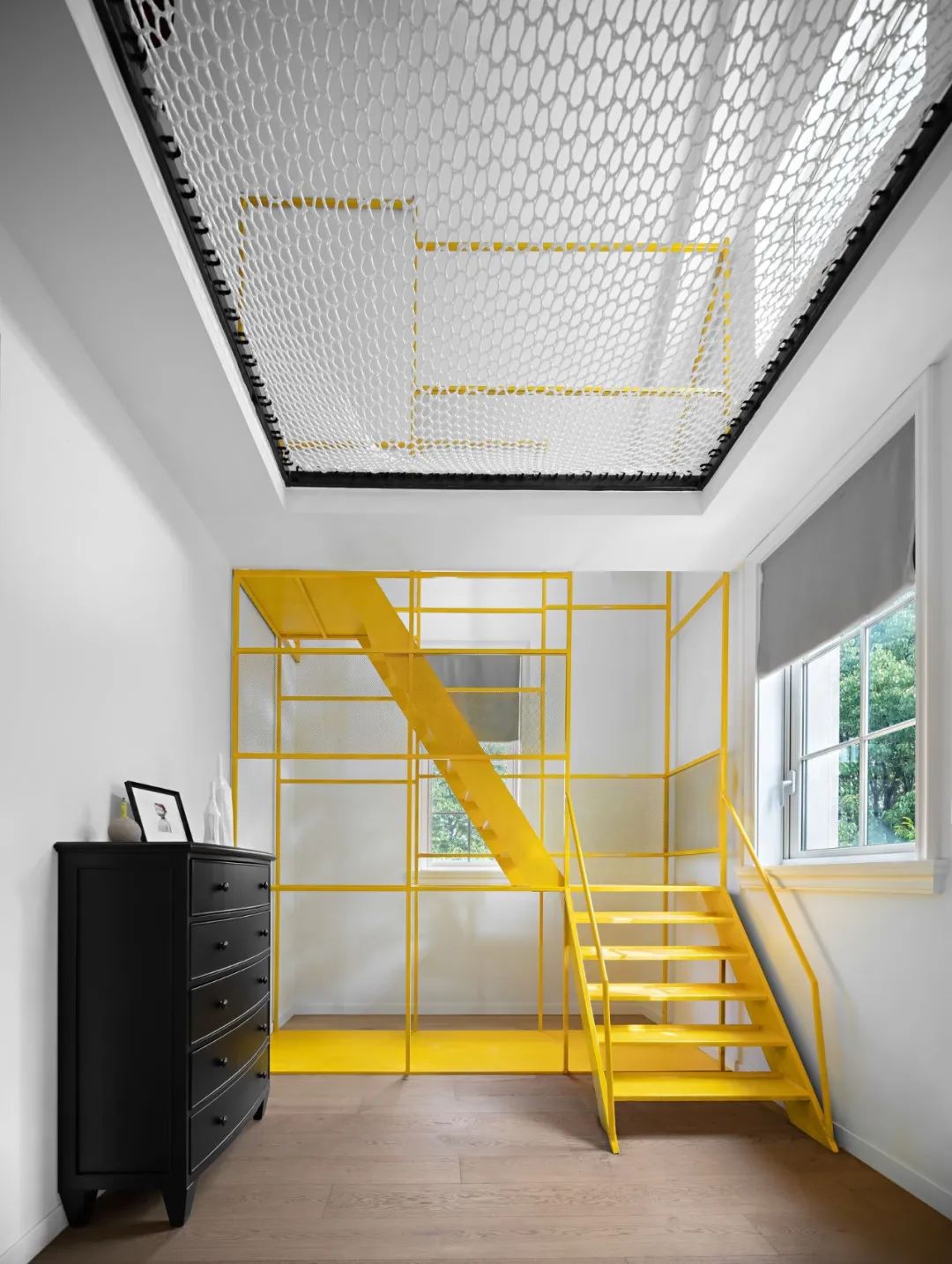 兒童房是由原玄關(guān)中庭加建出來的,保留了建筑原有的石材墻面。設(shè)計(jì)師以原房間結(jié)合頂部的高度,做了一個(gè)充滿趣味的兒童活動(dòng)區(qū):明黃色的攀爬梯與白色睡繩網(wǎng),不需裝飾就很受歡迎。
