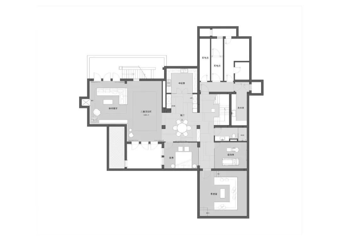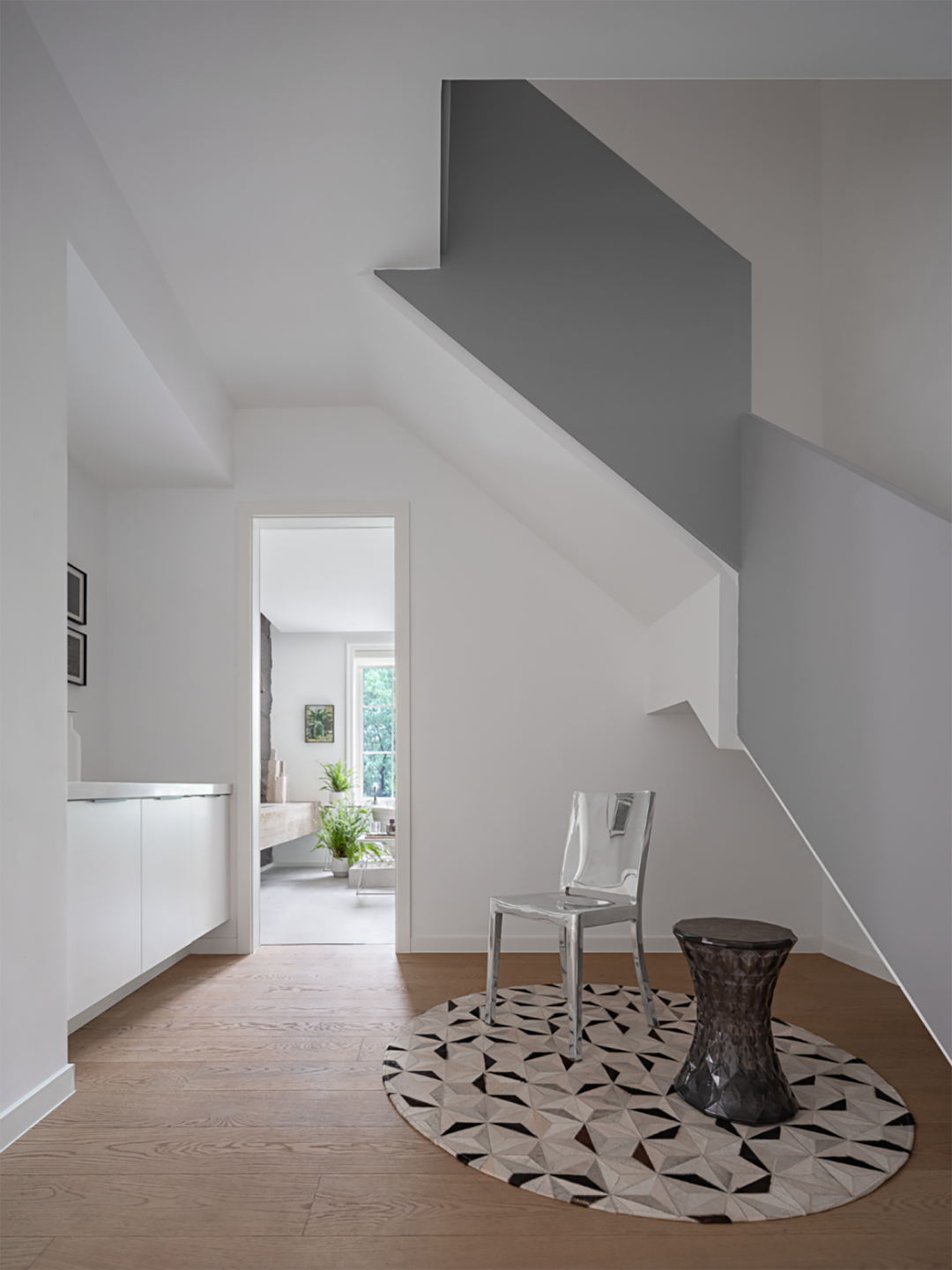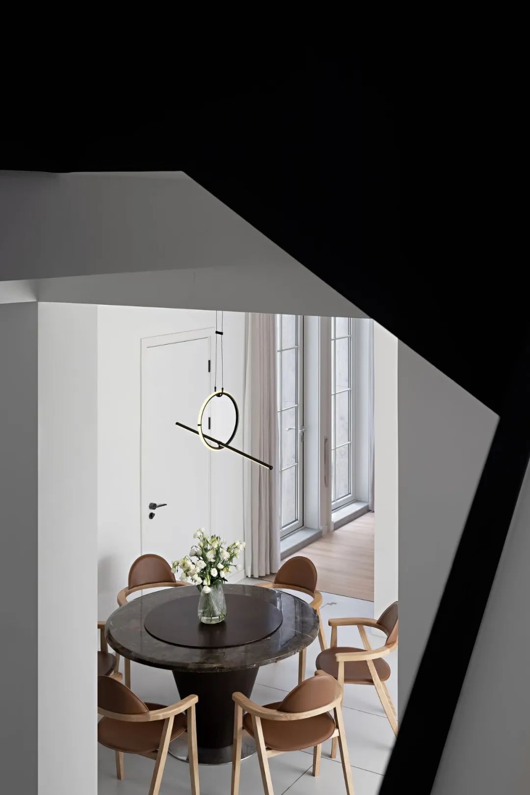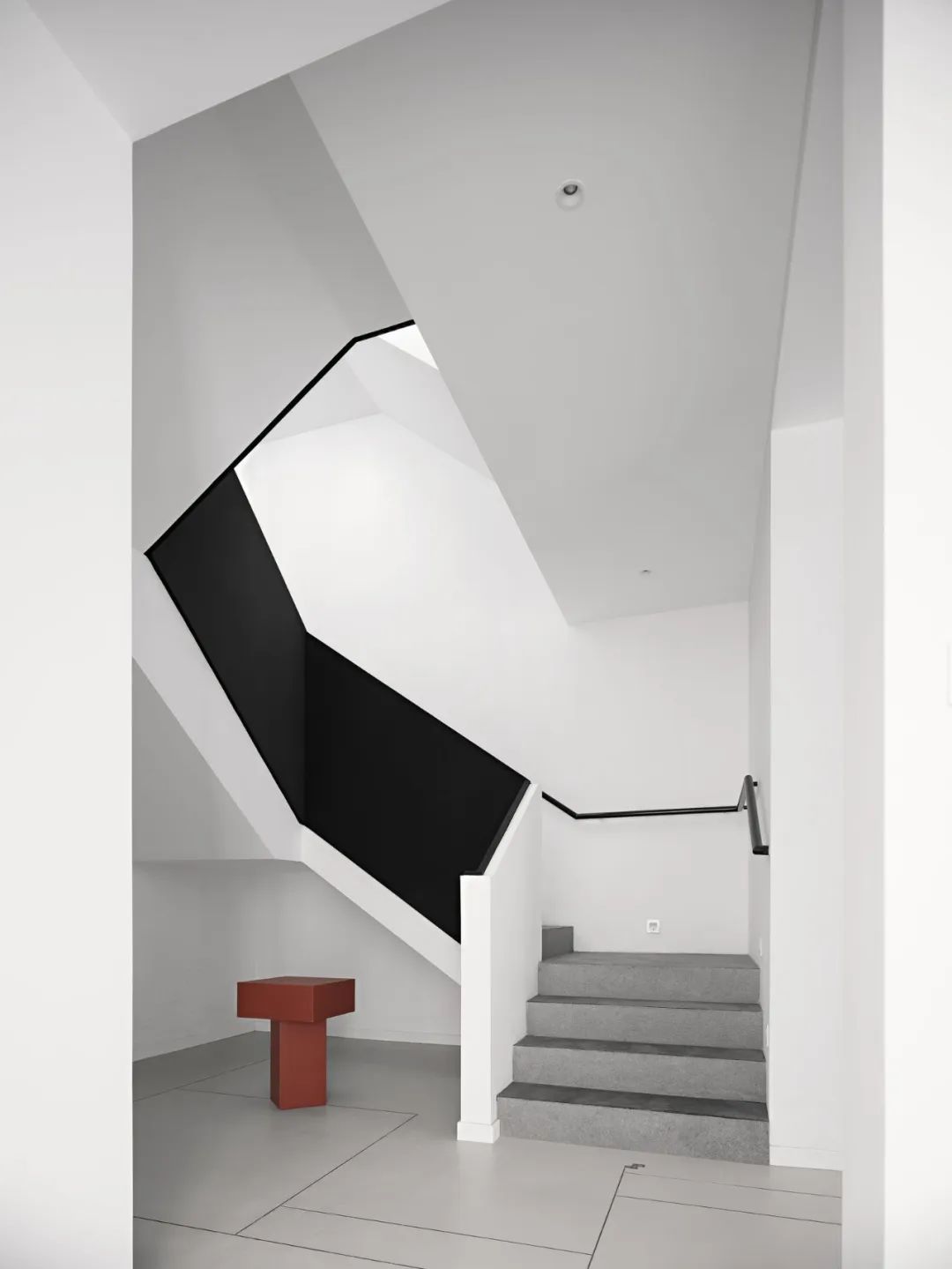 無論在黑白灰轉(zhuǎn)折分明的樓梯區(qū)域,還是在灰白盒子彼此穿插的西廚空間,強(qiáng)烈的虛實(shí)對(duì)比、前后層次以及這種讓人感覺舒適的形式,都是通過對(duì)比例的嚴(yán)格控制產(chǎn)生的。