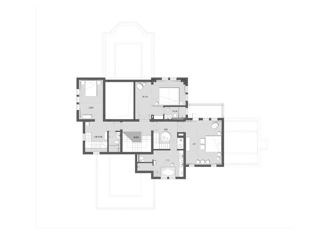 樓梯正對(duì)的老人房光照充裕,得益于透光卻不透明的冰柱玻璃隔斷,床側(cè)的扶板設(shè)計(jì)也兼?zhèn)浜芰藢?shí)用功能。