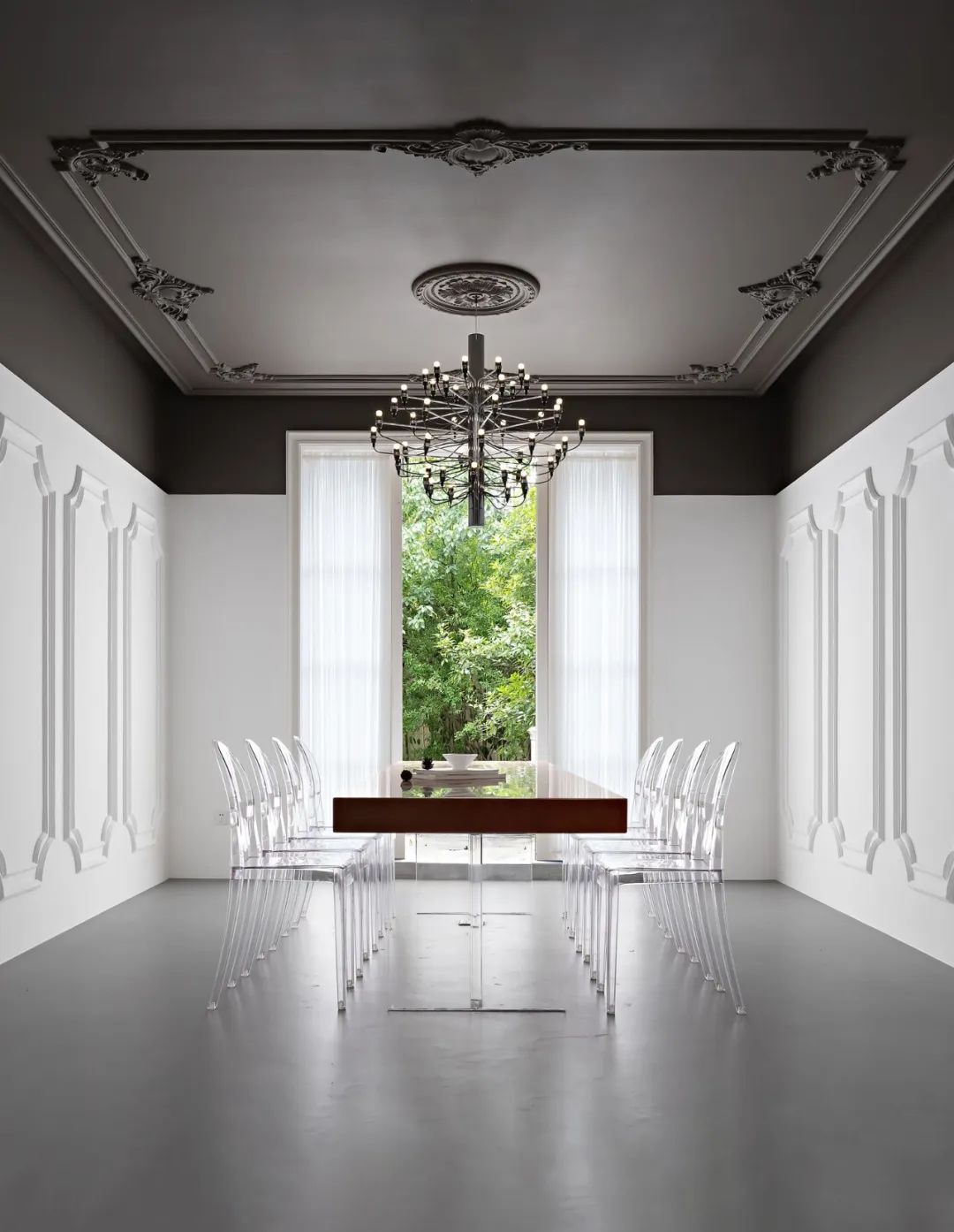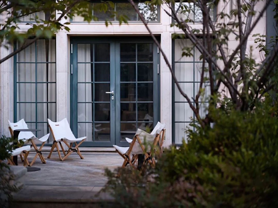 簡(jiǎn)約的庭室中央,透明餐椅與桌腿形如懸浮在空中,背后一扇可供自由行走的單門鏈接內(nèi)外,建筑的嚴(yán)正與自然的柔和開啟不同次元的對(duì)話。超現(xiàn)實(shí)主義手法讓空間走進(jìn)新維度。