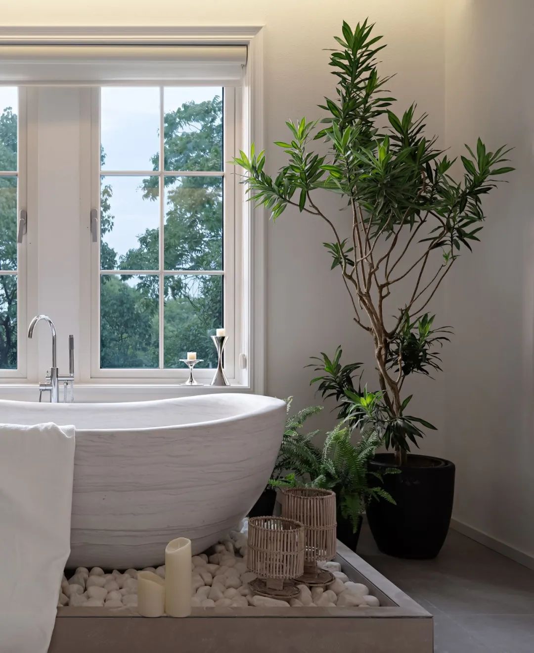 二層主臥采用了細(xì)紋白色乳膠漆墻面與木地板,豐富柔和、明亮舒適。主衛(wèi)窗前的獨(dú)立浴缸極盡浪漫,在自然石材與綠色植物的襯托下仿佛露天浴場(chǎng)。