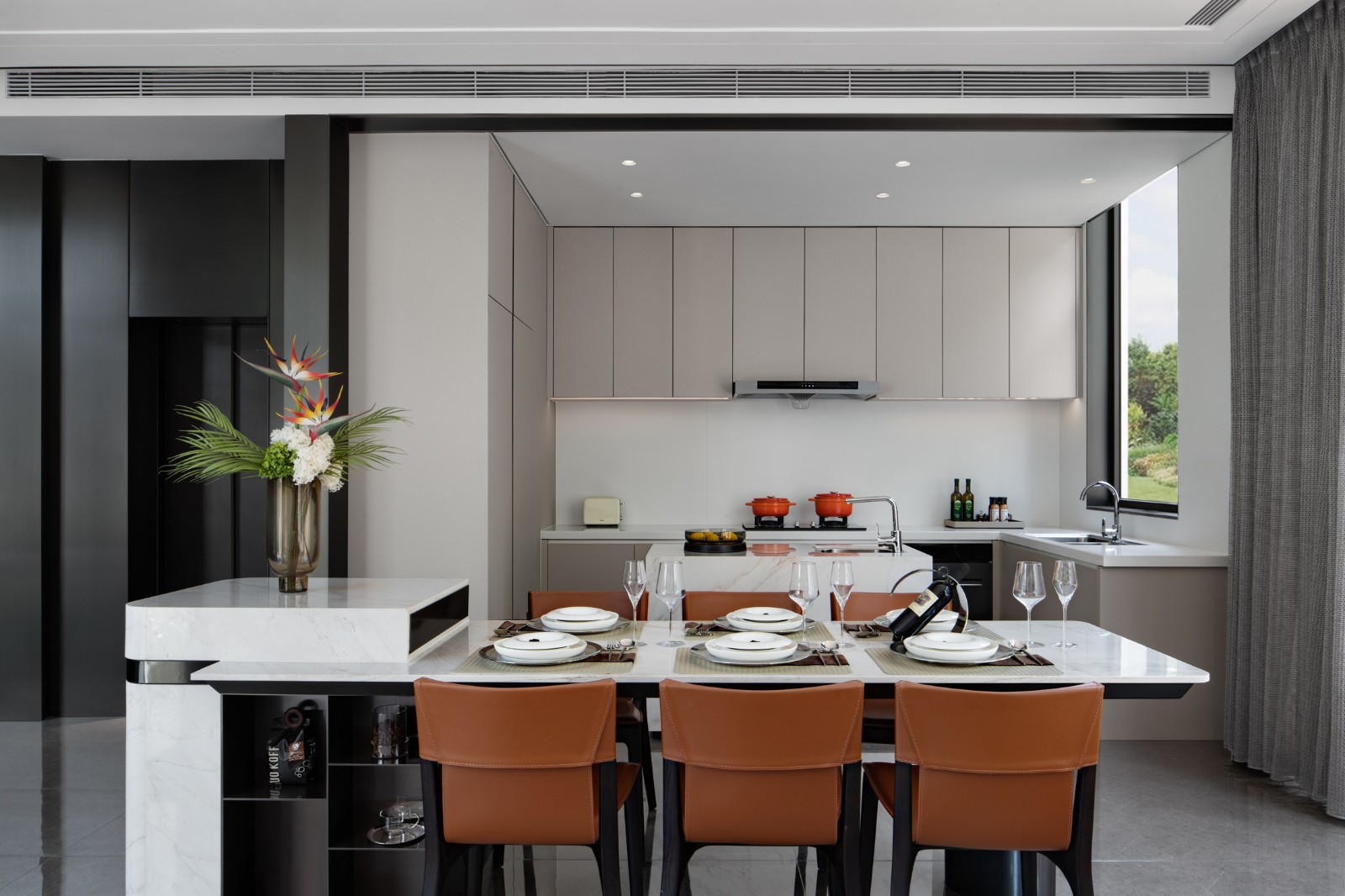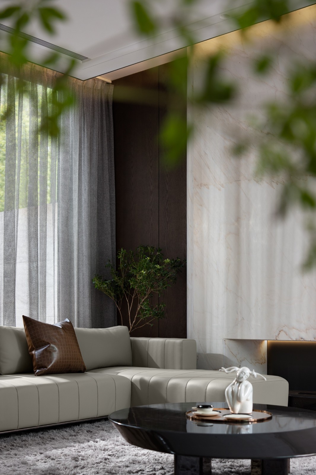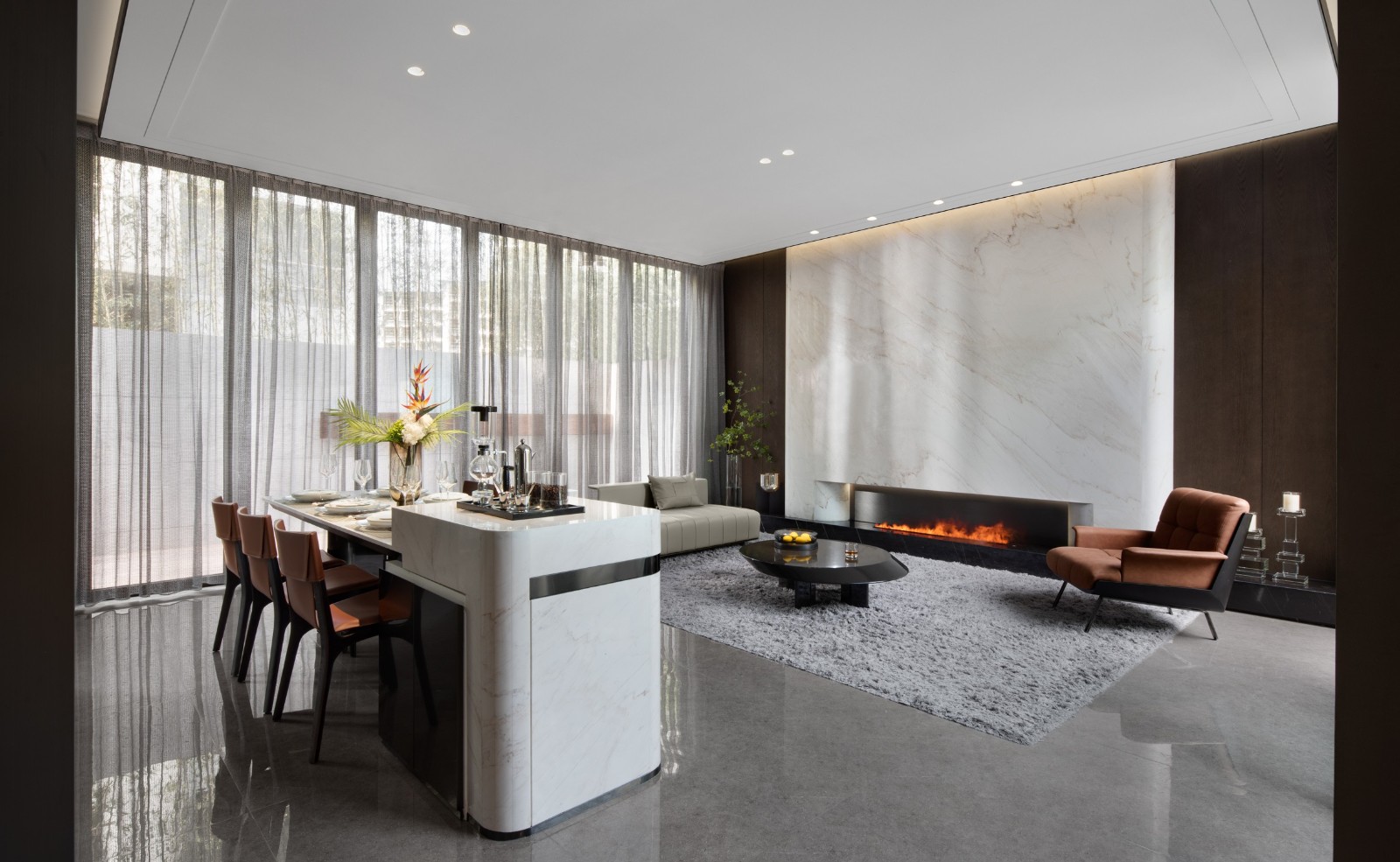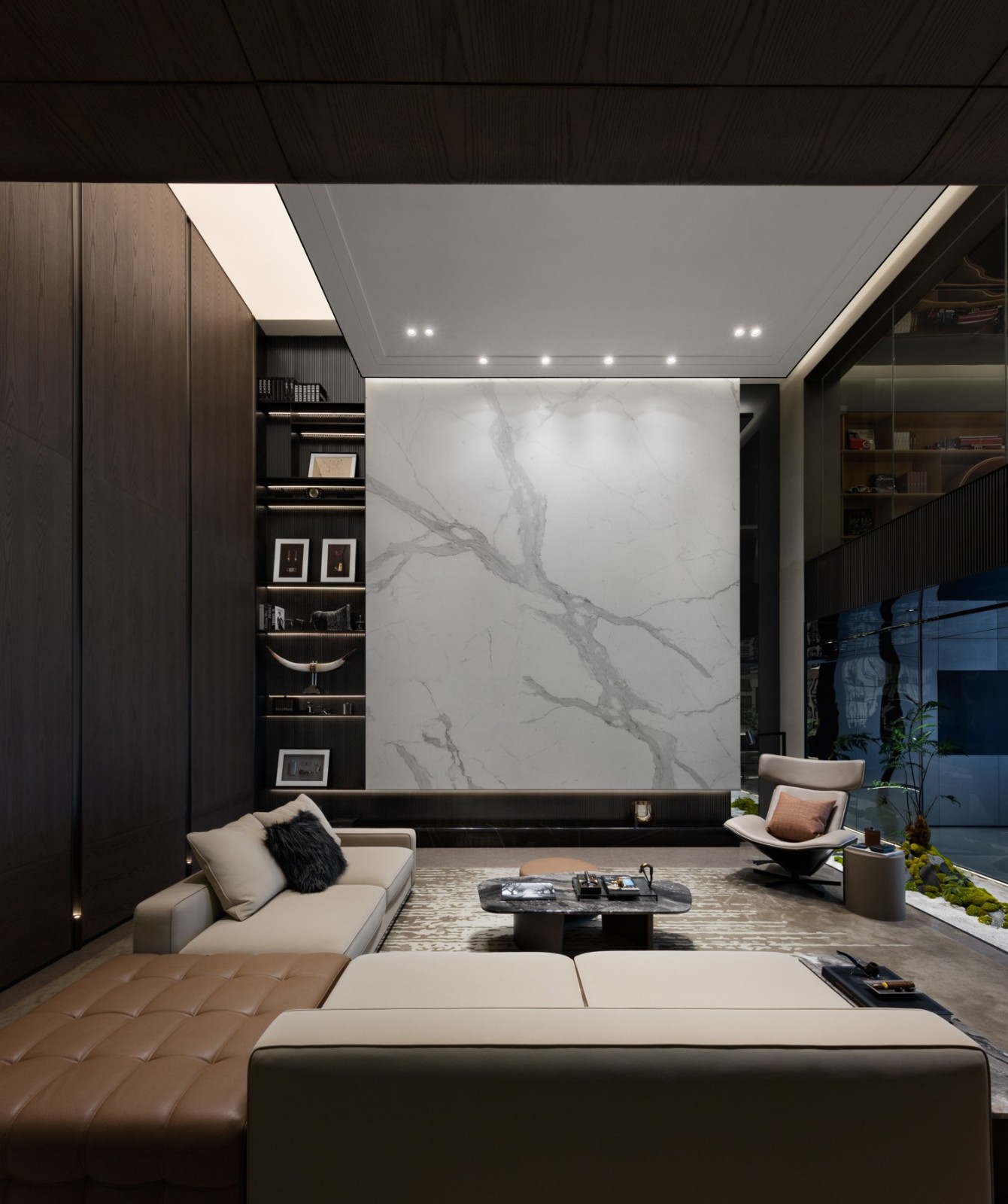 濃郁的深棕木紋、潔白的大理石、硬朗的皮革共同延續(xù)著待客空間的色彩脈絡(luò)與美學(xué)肌理,全景式落地門窗收納著來著戶外的陽光與綠意。