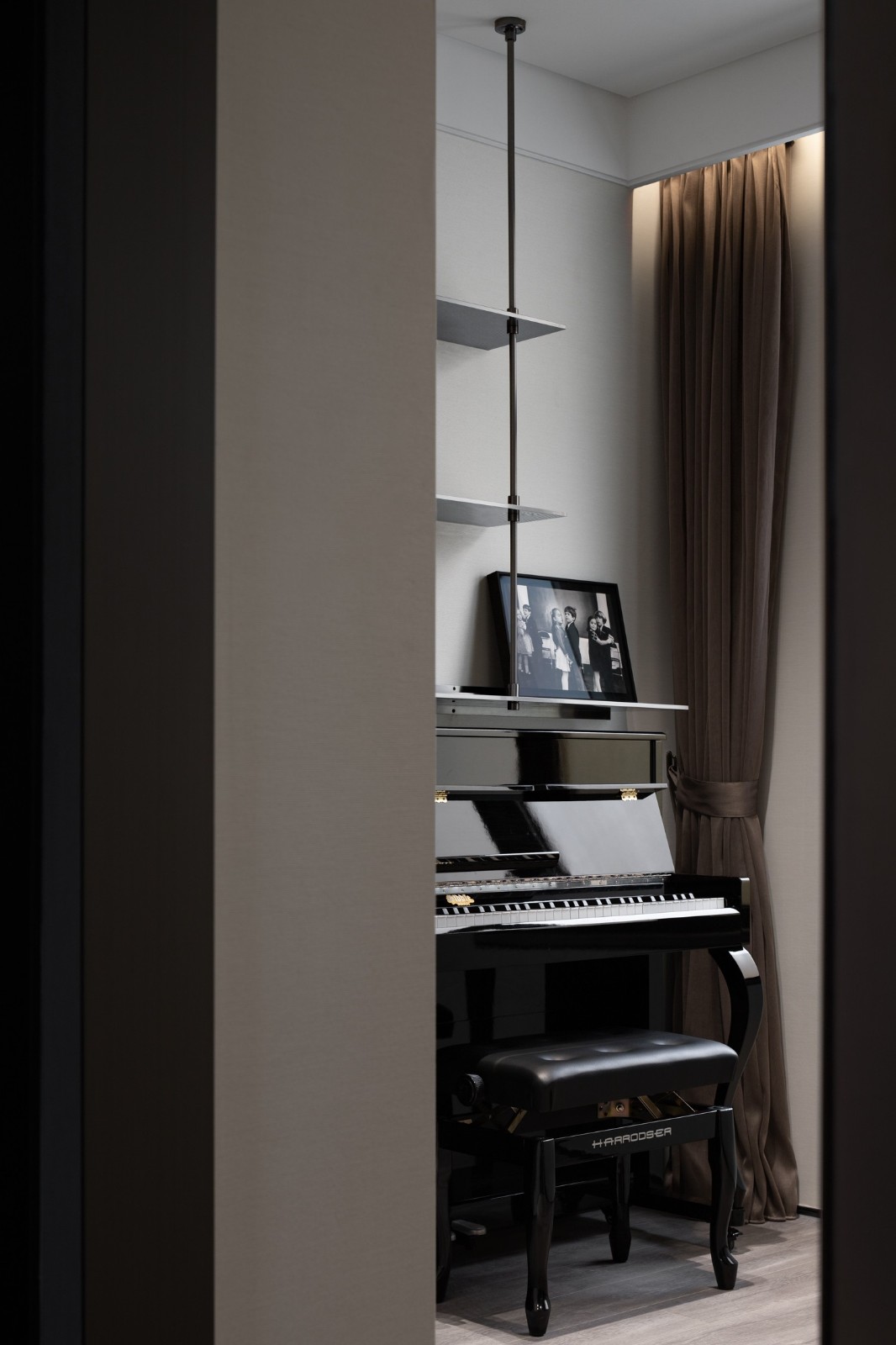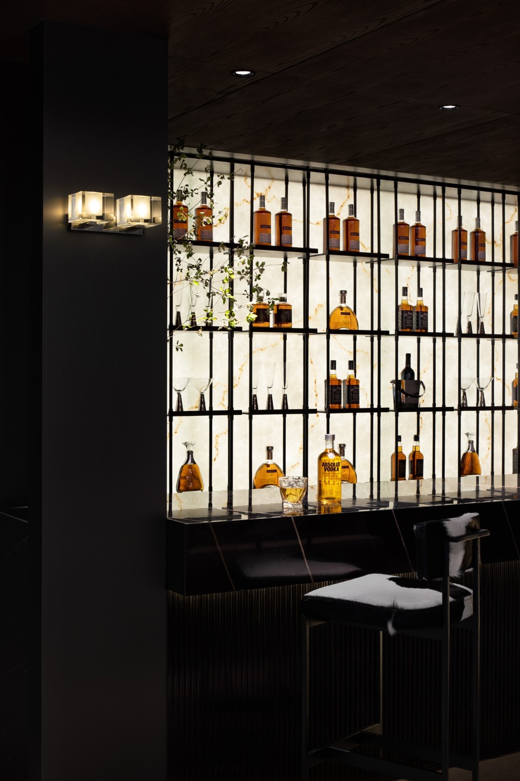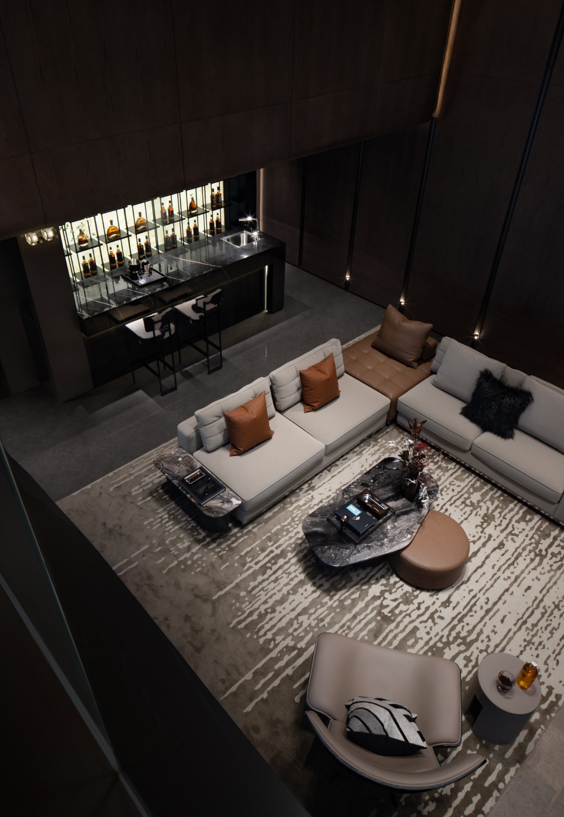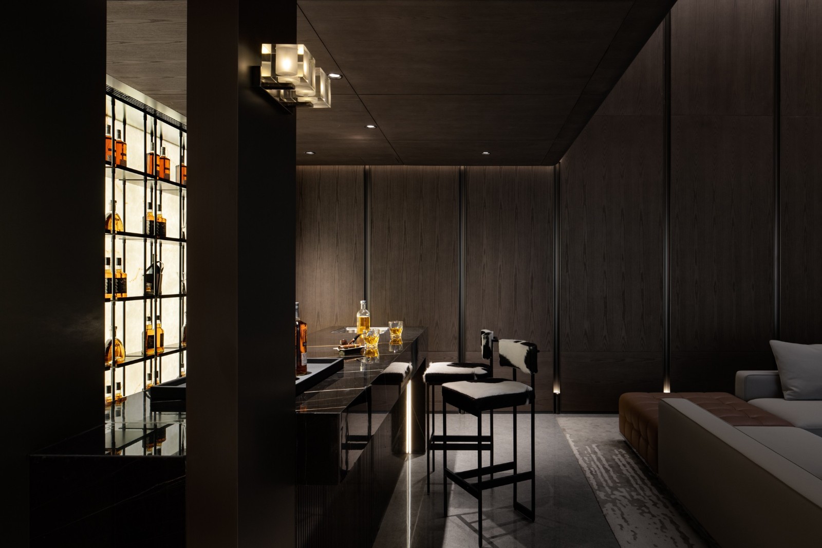 轉(zhuǎn)角樓梯下方創(chuàng)設(shè)的酒吧空間里,燈光和酒瓶折射著光影的明暗,這里著重個(gè)人精神世界的獨(dú)立。通過黑色大理石吧臺(tái)的體量與會(huì)客廳白色大理石的塊立面對(duì)比產(chǎn)生視覺上的對(duì)話,也強(qiáng)調(diào)著個(gè)人世界與家庭公共區(qū)域的呼應(yīng)和互動(dòng)。