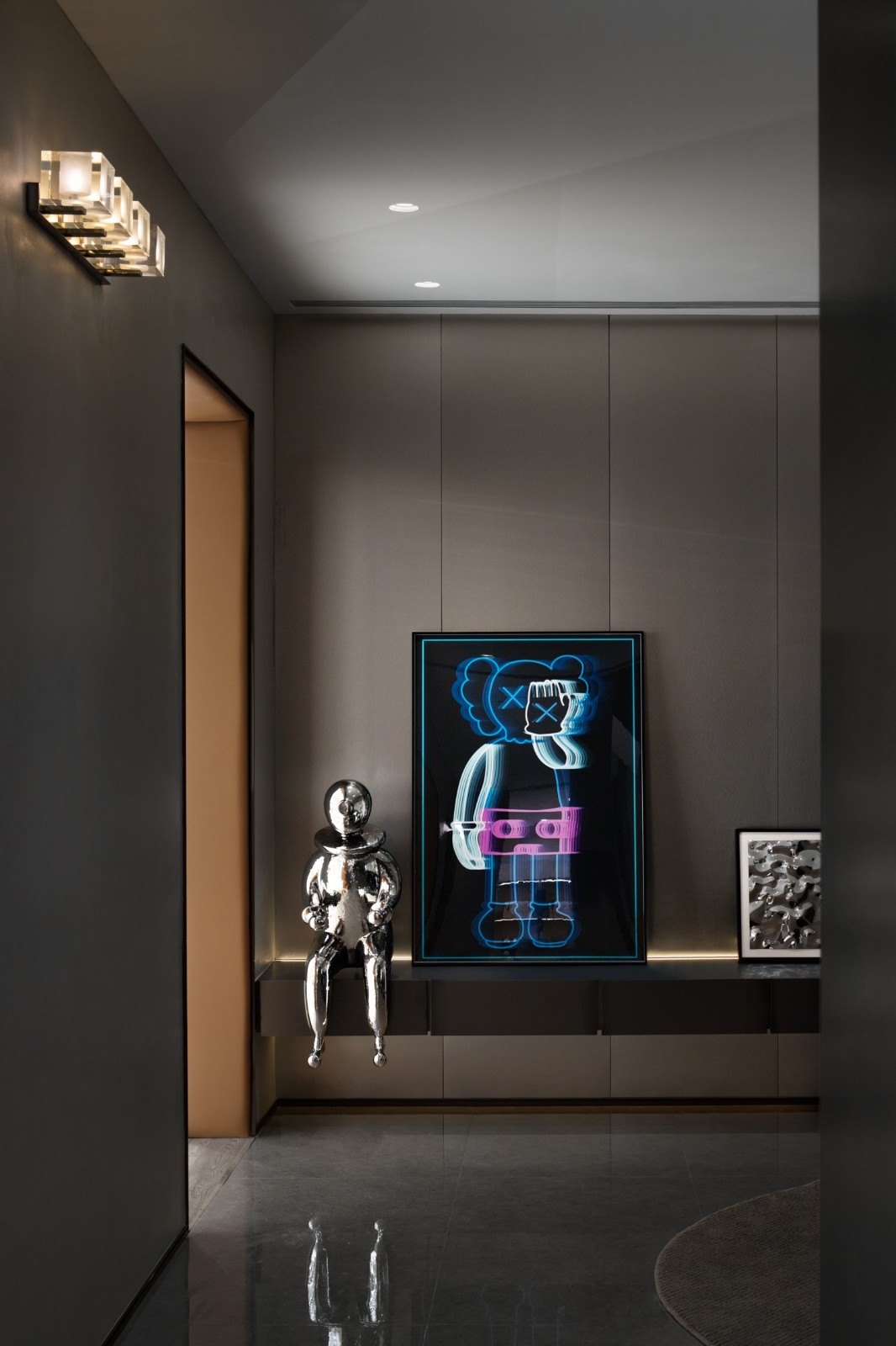 墻面掛畫上閃爍著極富未來科技感的光澤,與KAWS藝術(shù)玩偶的潮玩元素交織融為一體,為VR影音電競(jìng)室注入超現(xiàn)實(shí)感;戴上VR頭盔,沉浸于3D虛擬世界,如身臨其境地體驗(yàn)運(yùn)動(dòng)、娛樂、觀影帶來的趣味,為空間呈現(xiàn)出個(gè)性獨(dú)特的光芒。