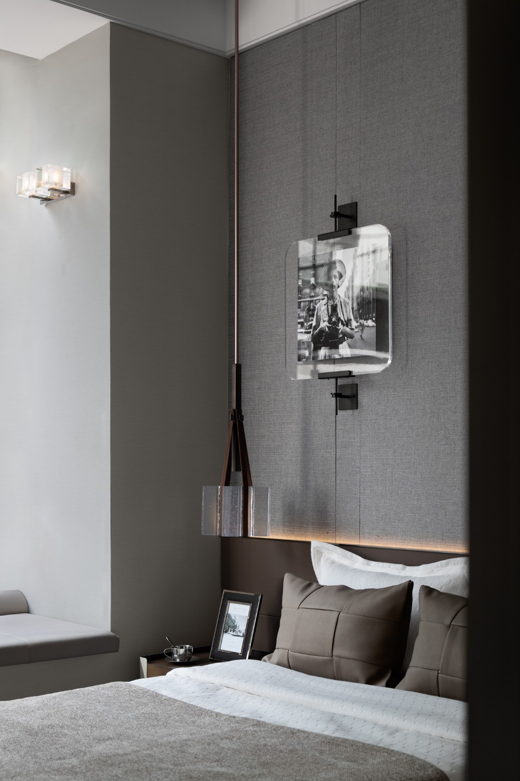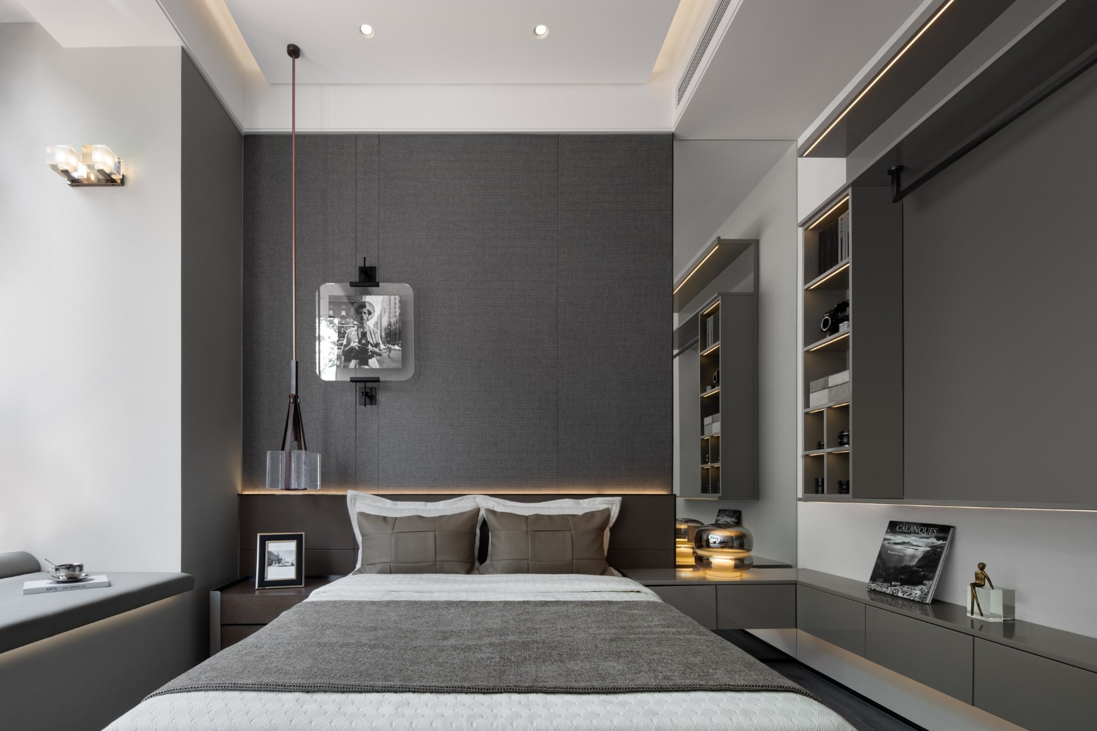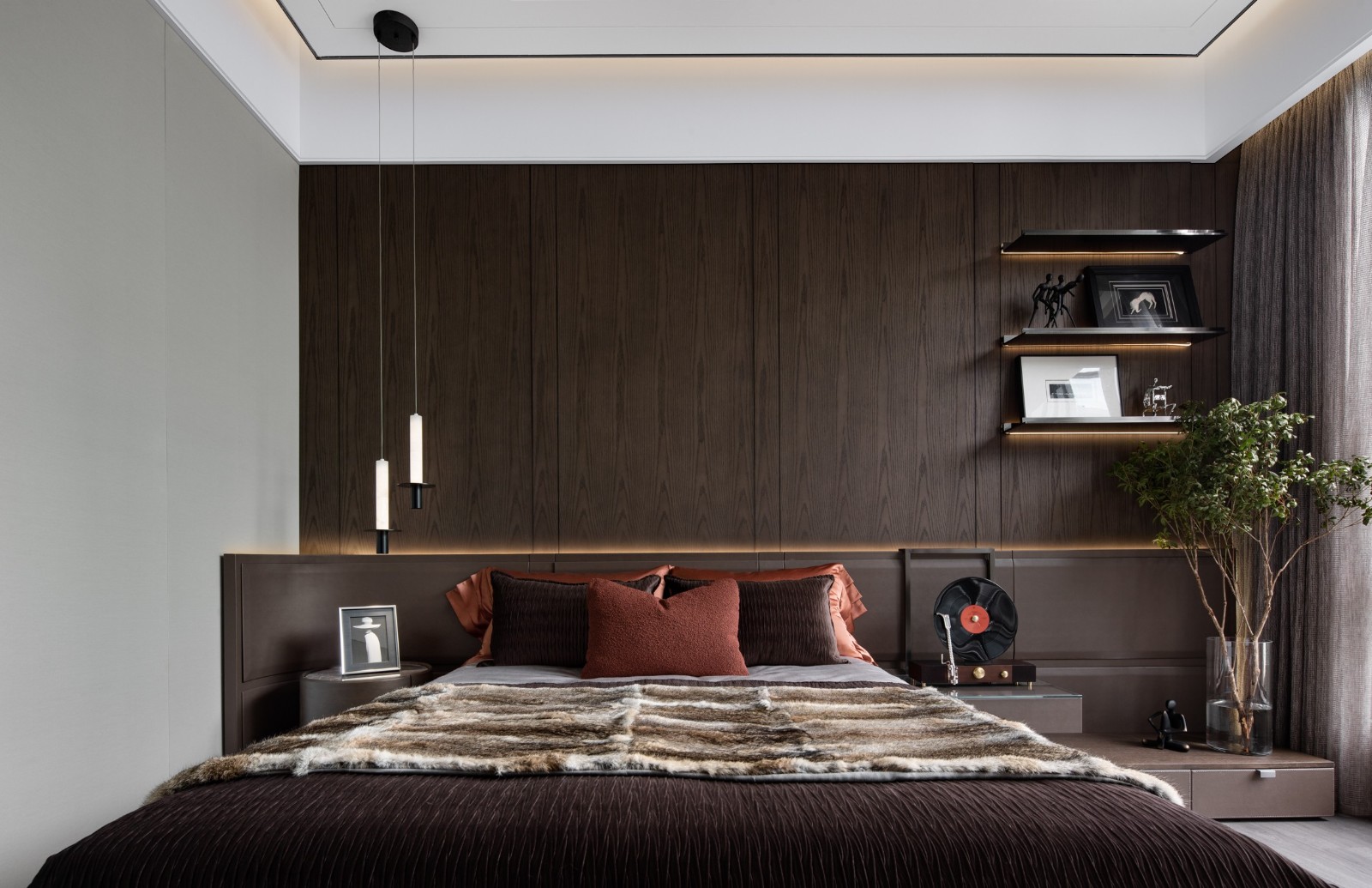 木、金屬、皮革、織物交織融合成的主臥空間,在現(xiàn)代設(shè)計(jì)語言的把握上賦予了空間新的藝術(shù)格調(diào)。