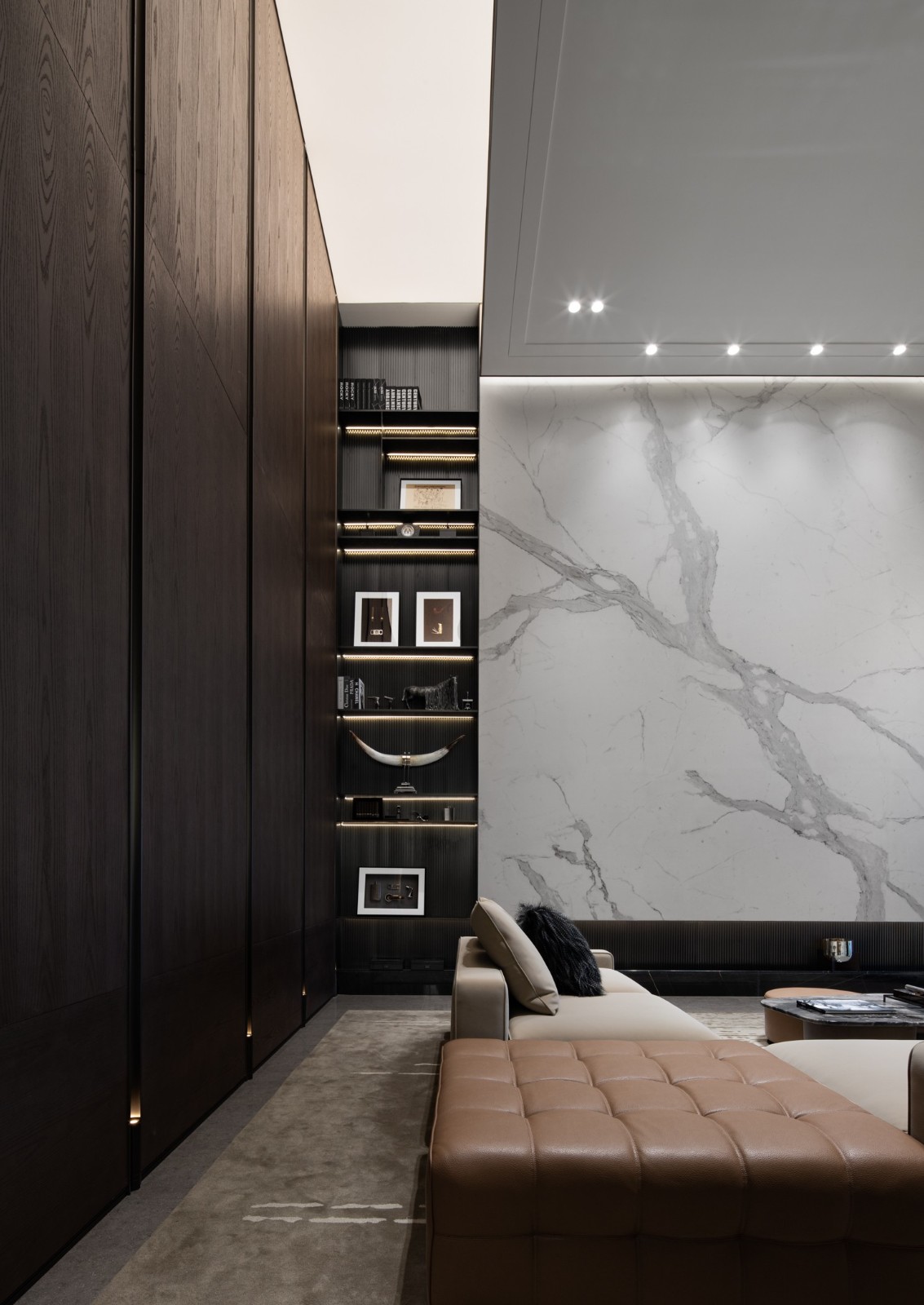 歸家動(dòng)線自負(fù)一層車庫延伸開來,無縫連接會(huì)客空間,高聳濃郁的深棕木紋,調(diào)和潔白雅致的大理石立面,自帶中性氣息的硬朗皮革坐椅和沙發(fā),將空間氣息勾勒得猶如意式濃縮一般,濃厚香醇且回味無窮。