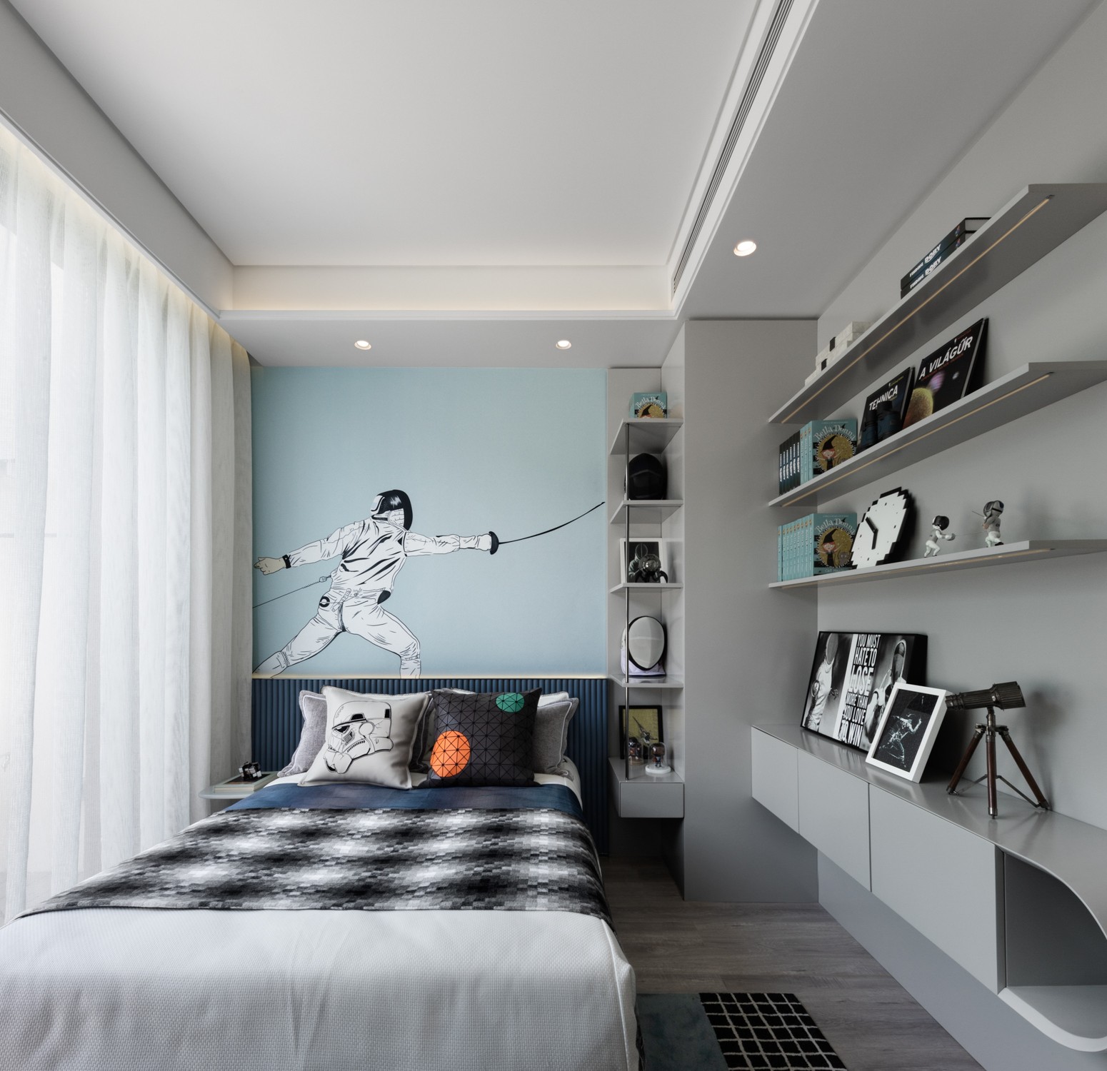 基于對(duì)未來的探索和期待,空間設(shè)色冷靜活潑,孩童的熱愛布滿整個(gè)空間,連接大自然的露天陽臺(tái),給予孩子更多獨(dú)立成長的空間。