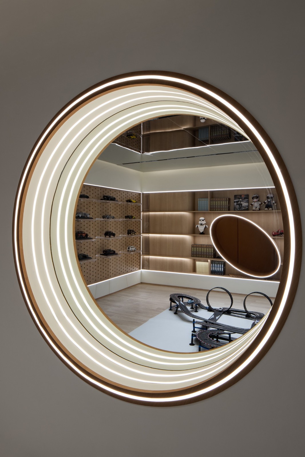 考慮負(fù)一夾層的層高,突破建筑初始層板邊界拓展垂直空間尺度,采用下沉的設(shè)計(jì)手法構(gòu)建親子游戲室,并結(jié)合原有梁架結(jié)構(gòu)打造了整面可收納的展示柜體,在柜體內(nèi)部空間巧妙地設(shè)置可供兒童穿梭嬉戲的隧道。
