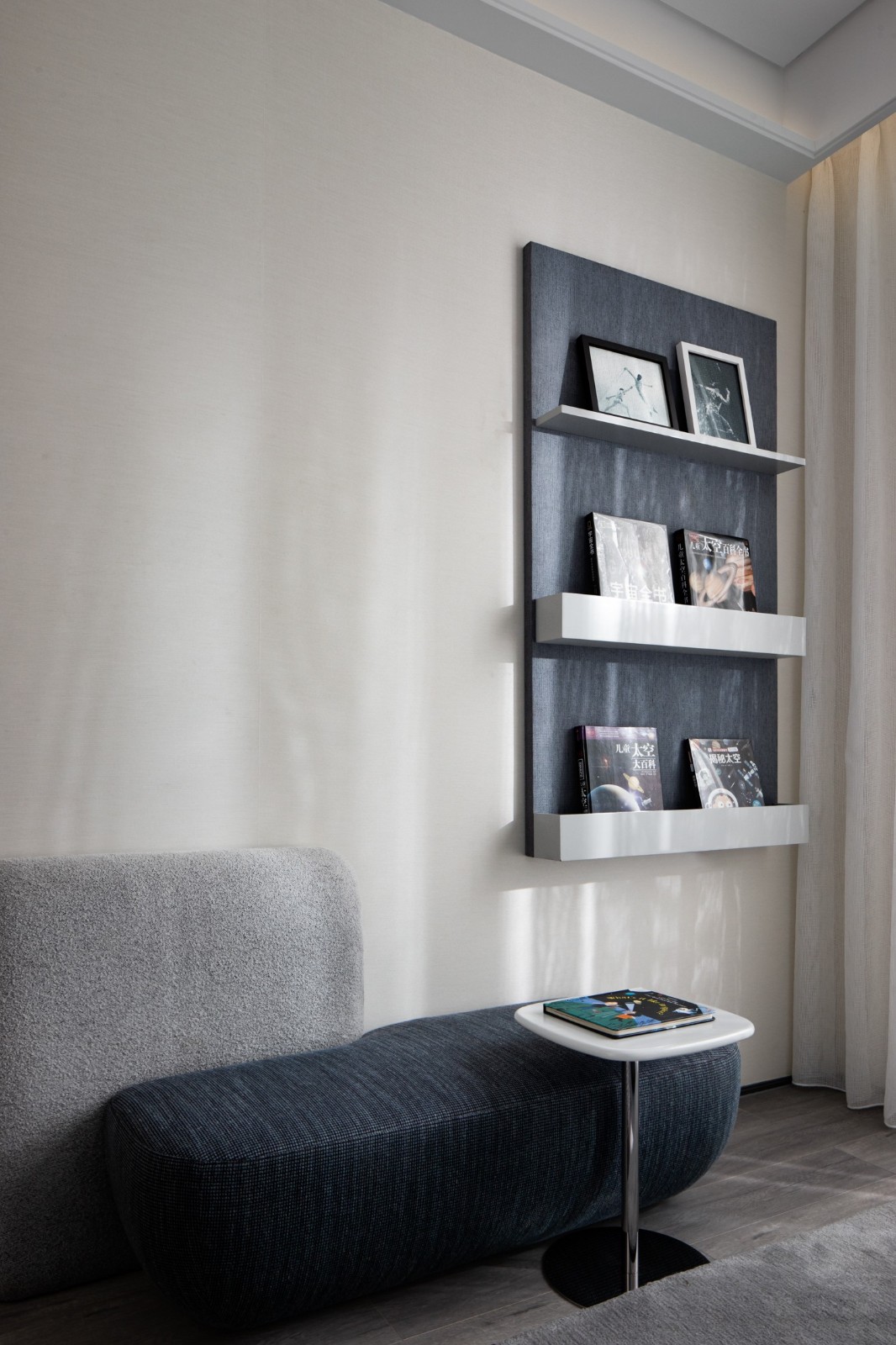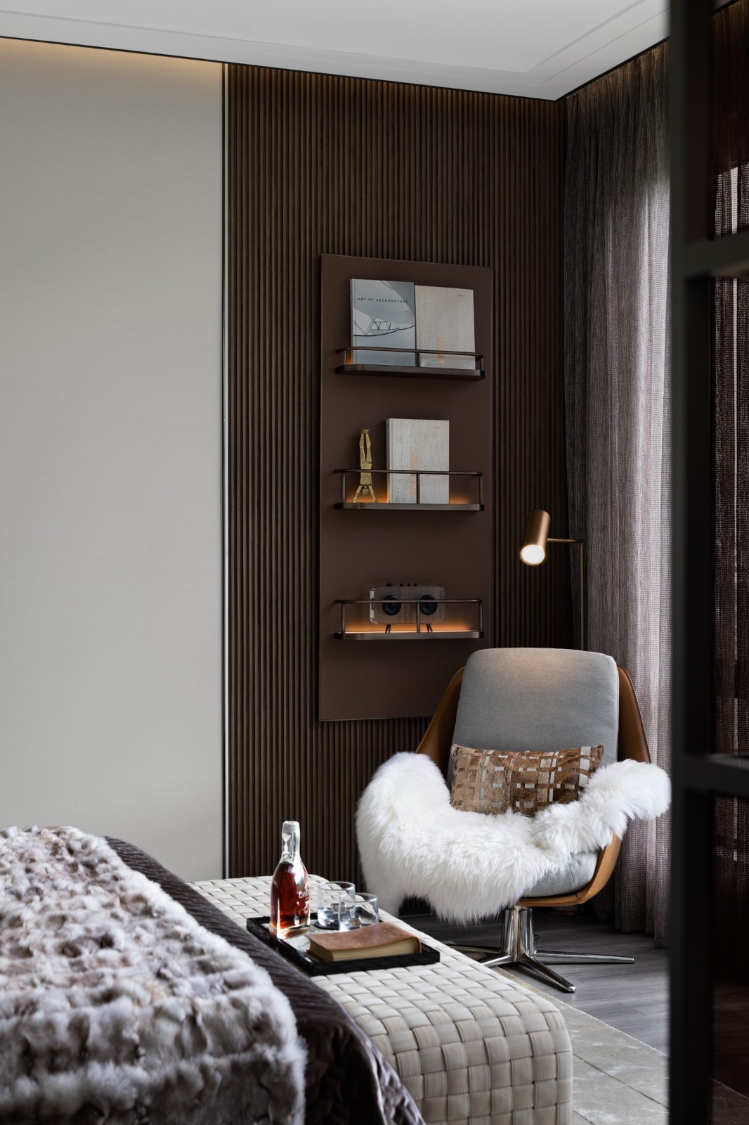 繁華觸手可及,自然近在咫尺,世間存在許多條通往美的途徑,設(shè)計(jì)團(tuán)隊(duì)深挖精睿階層的精神訴求以及他們對(duì)生命品質(zhì)的追求,在主臥的落地窗邊營造了一個(gè)可以自洽的安靜角落。