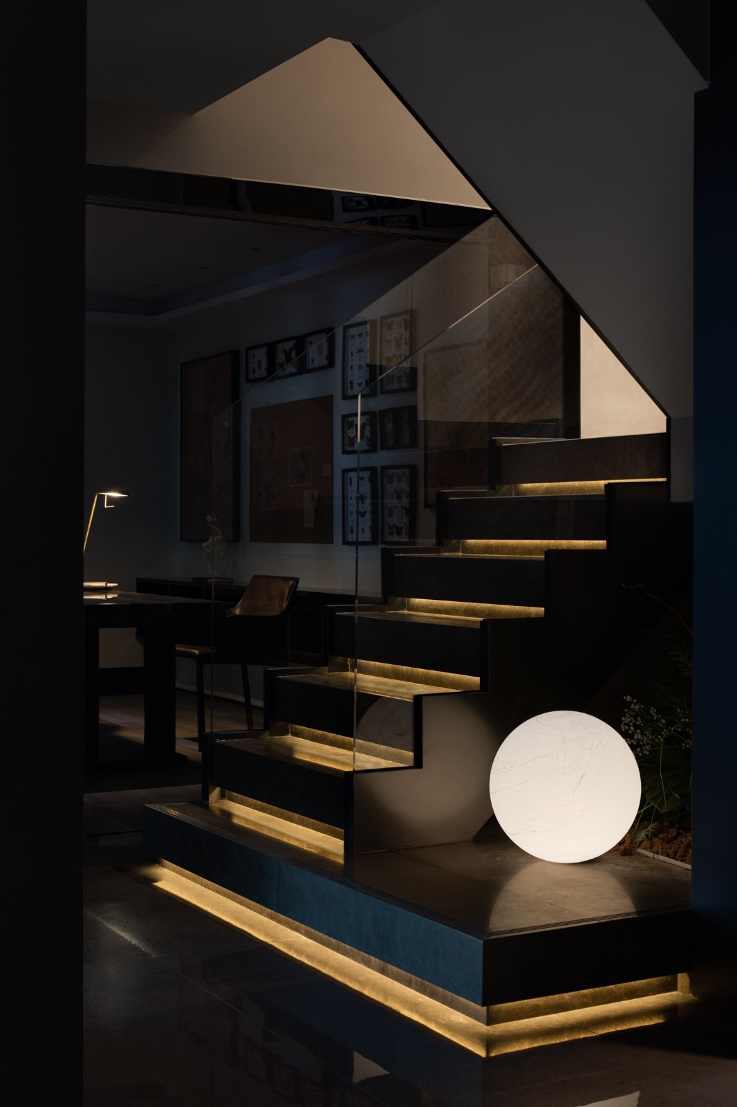 運(yùn)用落地玻璃打造了一條室內(nèi)景觀廊道,玻璃扶手的樓梯在空間視覺上取得精妙的平衡,空間變得通透同時(shí)延展著空間尺度,溫潤的燈光將空間浸潤得平靜而柔和。