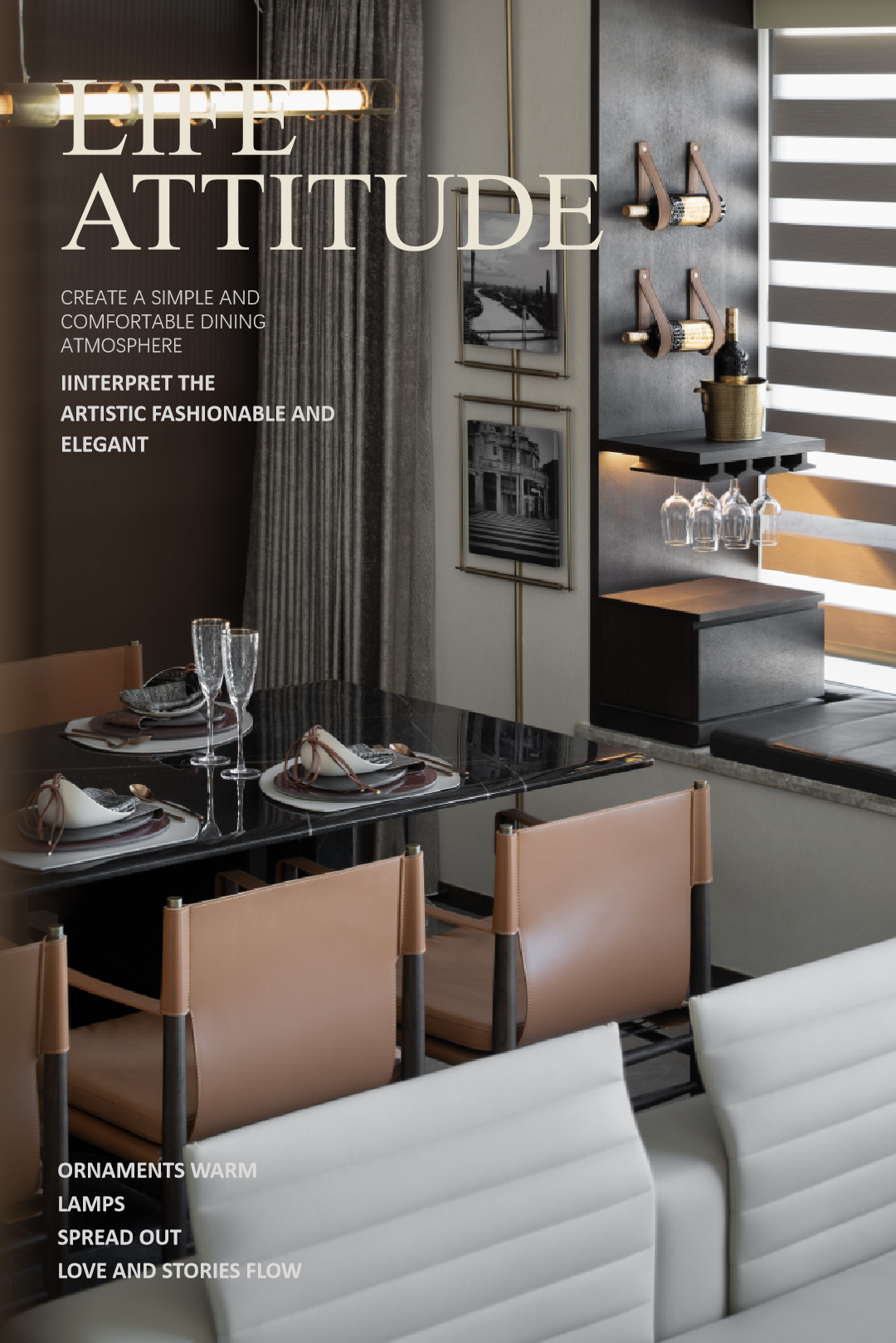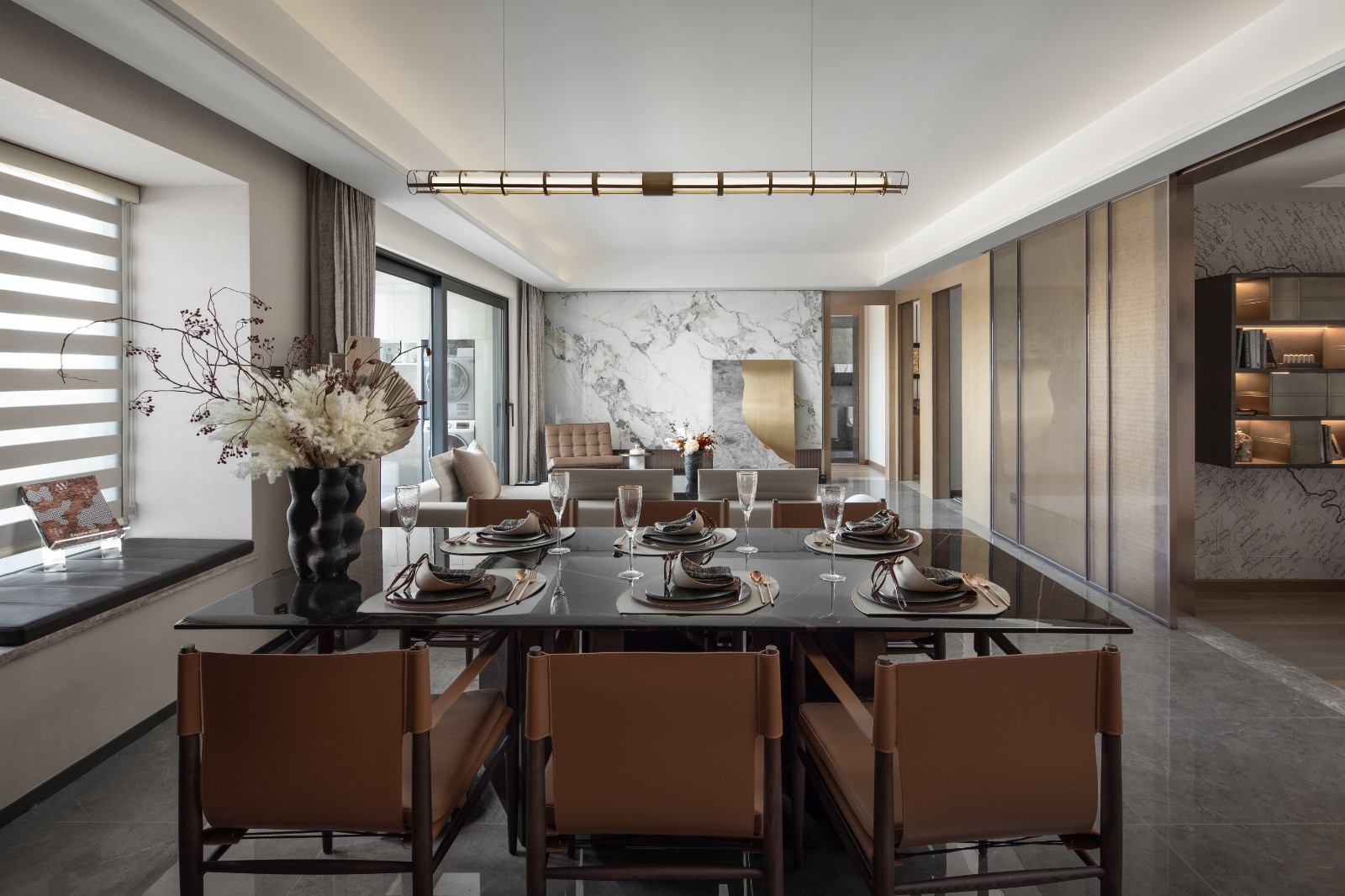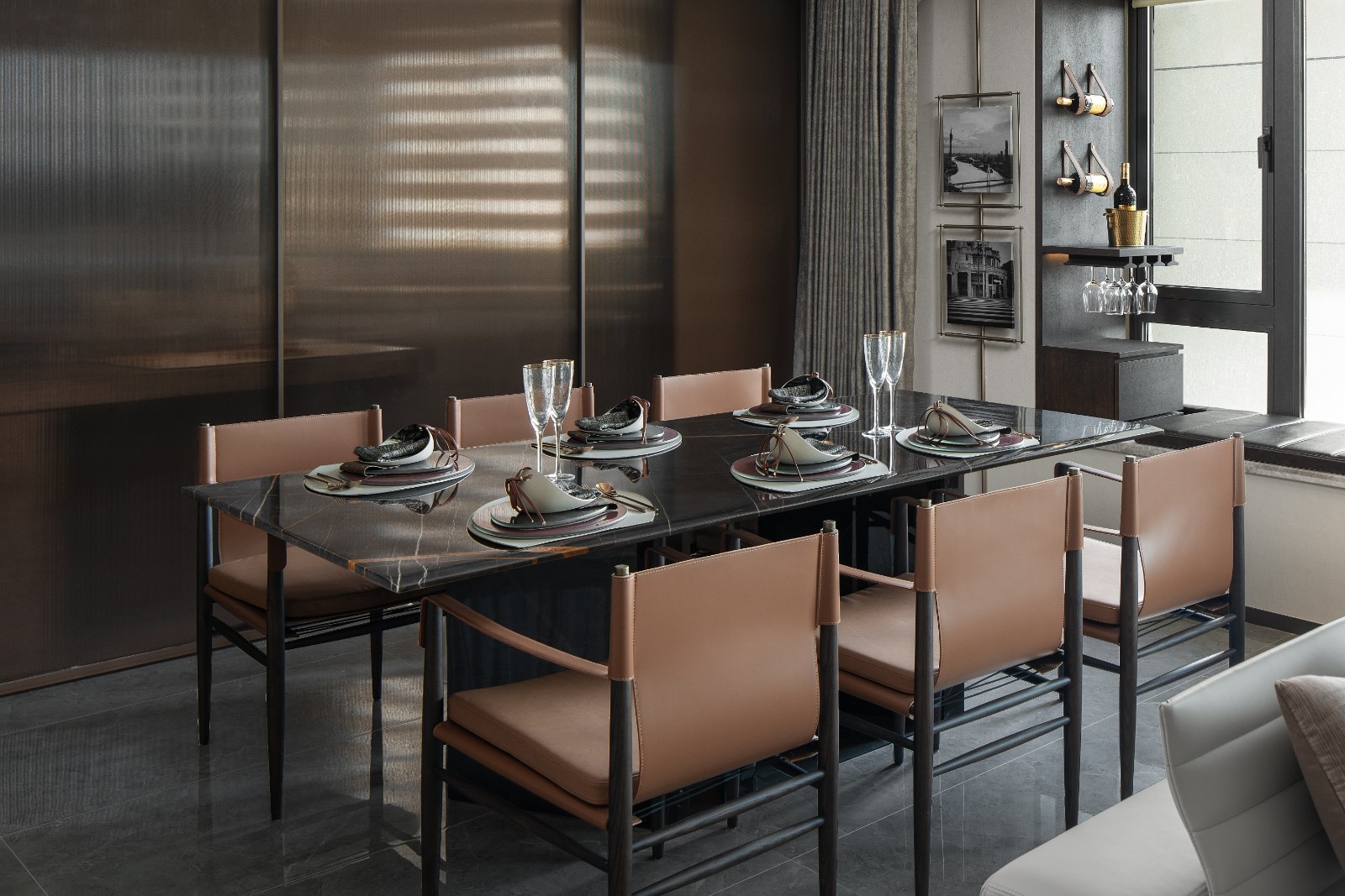 深咖色的皮質(zhì)餐椅搭配大理石方形餐桌,在燈光的映照下,輕松營造簡潔、舒心的就餐氛圍。