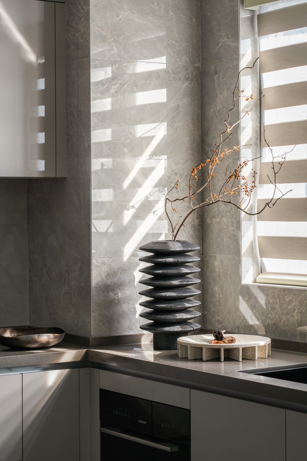 開放式的廚房與光影共舞,自然的生機讓空間更加通透而明亮,花藝的獨特造型凸顯人文氣質(zhì),重組了現(xiàn)代設(shè)計的靈魂所在。