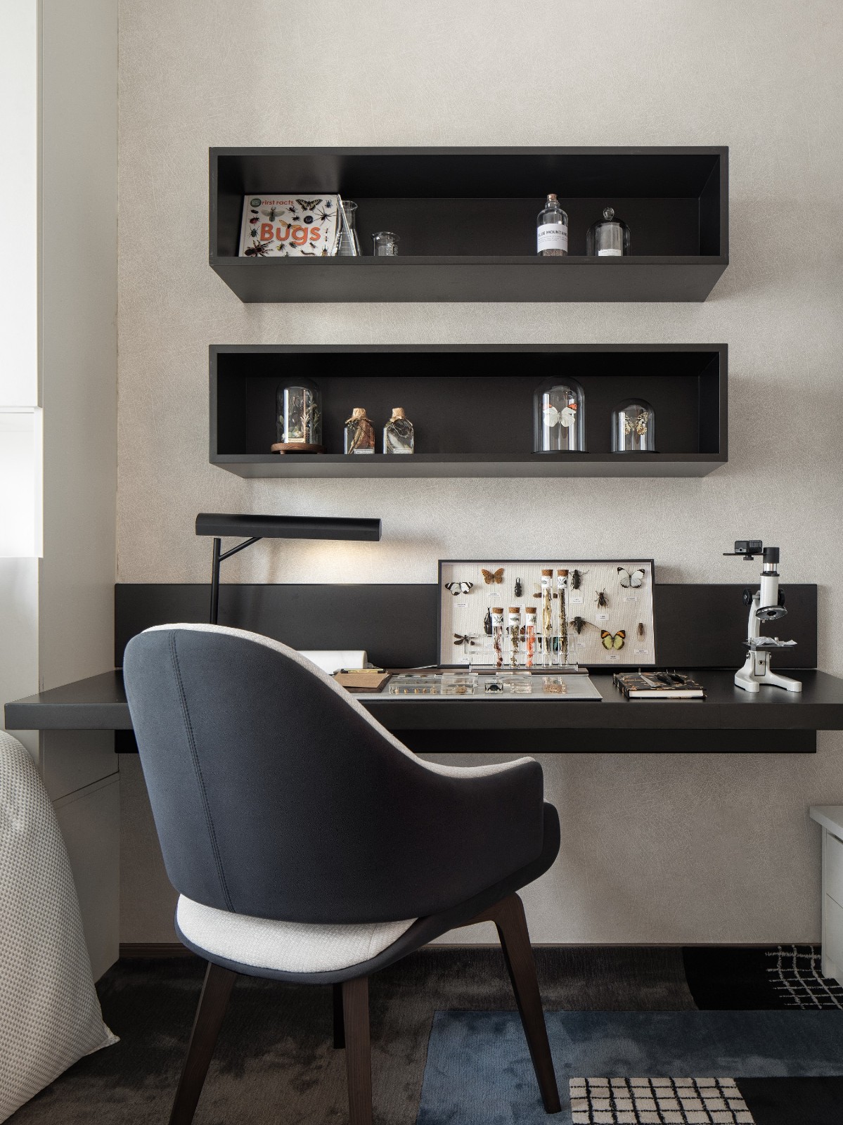 設(shè)計師利用戶型特點,利用墻角做了一個輕便式手工臺書桌,安靜,實用且兼具美觀,設(shè)計不應(yīng)留于表面,更應(yīng)深入生活。