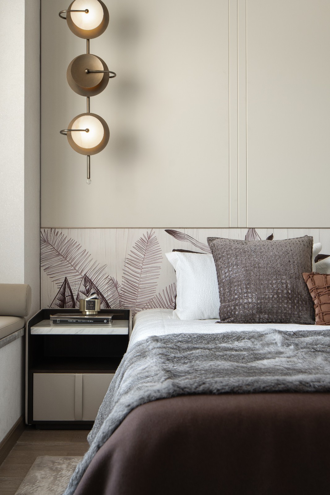 低調(diào)的大地色系與意式床品彰顯生活品質(zhì),呼應(yīng)生態(tài)綠居,設(shè)計以植物形態(tài)打造了一個可呼吸的綠意居所,臺面的穿插關(guān)系組合,層次錯落有致,營造空間的高貴感