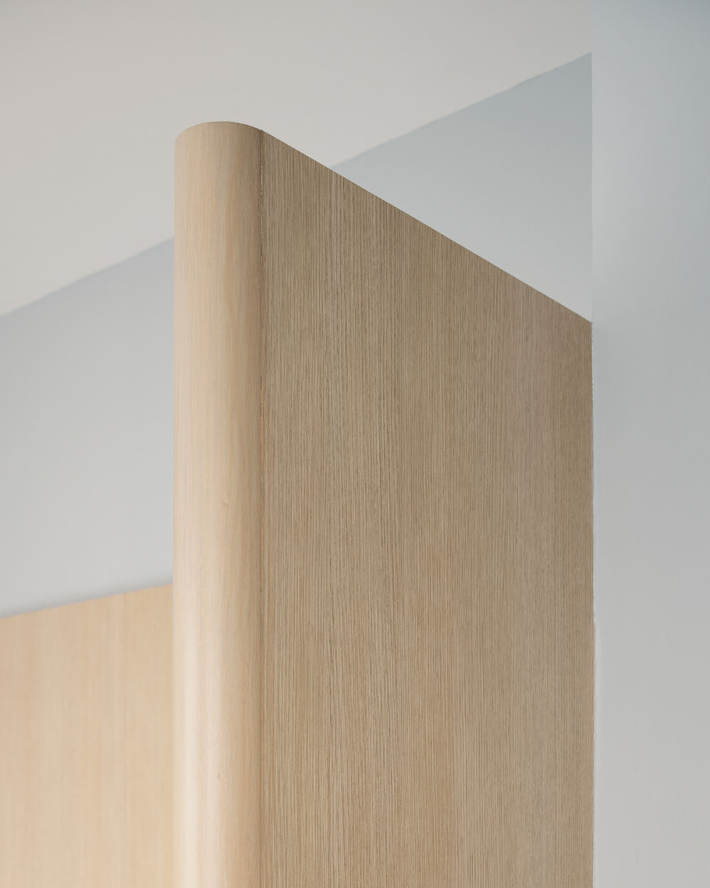 廚房和門廳入口墻被特色弧形玻璃隔斷取代,以最大限度地?cái)U(kuò)大起居區(qū)的視覺(jué)范圍。這些弧形玻璃的設(shè)計(jì)細(xì)節(jié)、圓角和墻板的木飾邊都是與中峇魯莊園標(biāo)志性建筑曲線相呼應(yīng)的元素。