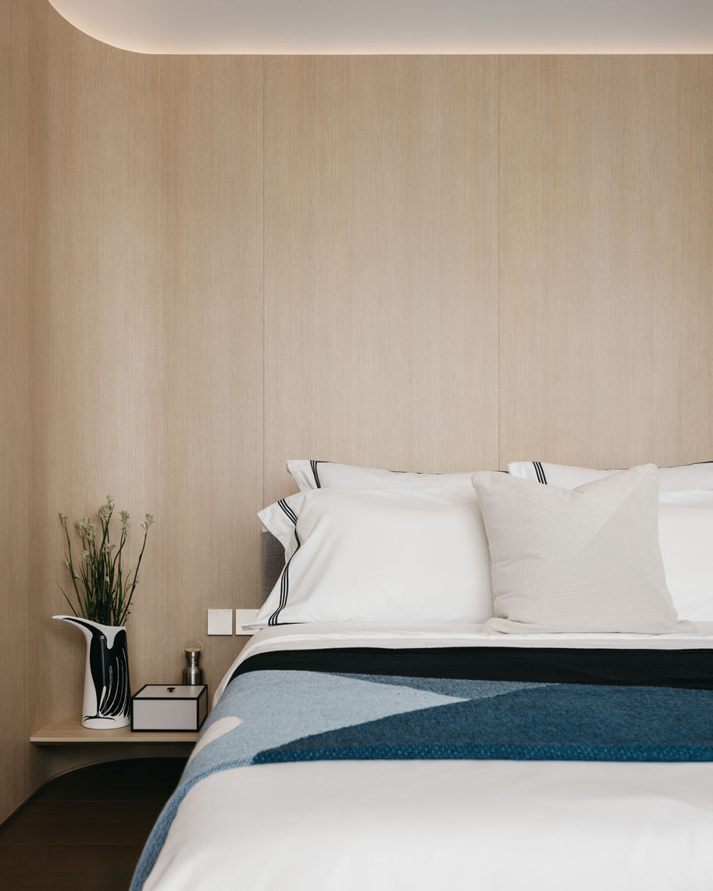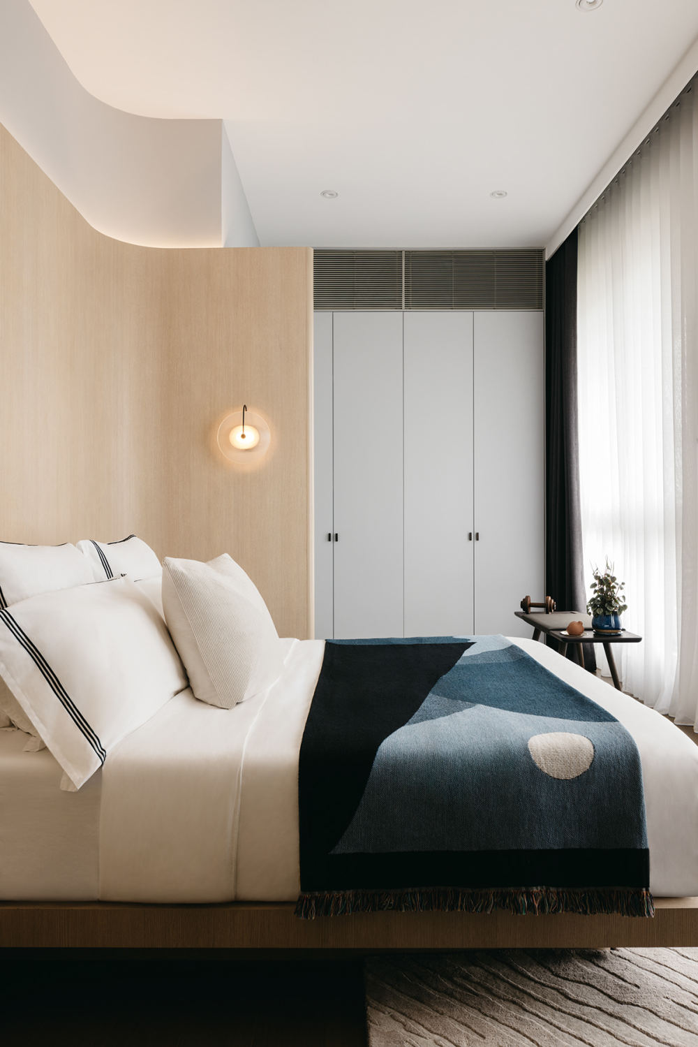 這樣的想法也可以在主臥室看到?,F(xiàn)有的臥室 2 與主臥室相結(jié)合,營(yíng)造出豪華的布局,無(wú)縫橡木飾面墻板作為主臥室的背景,俯瞰中巴魯村一覽無(wú)余的景色。