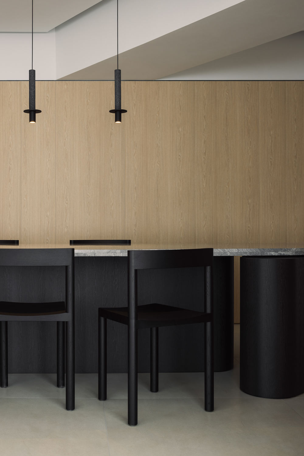 現(xiàn)有的較高樓層有助于將用餐區(qū)與起居區(qū)區(qū)分開來,同時(shí)仍保持兩個(gè)空間之間的視覺連通性。在那個(gè)用餐區(qū)內(nèi)有一張定制的餐桌,上面包裹著黑色的木材飾面和精致的灰色大理石臺(tái)面,增添了一種奢華感,因?yàn)樗谶@個(gè)空間內(nèi)并置為一個(gè)個(gè)性鮮明的作品。