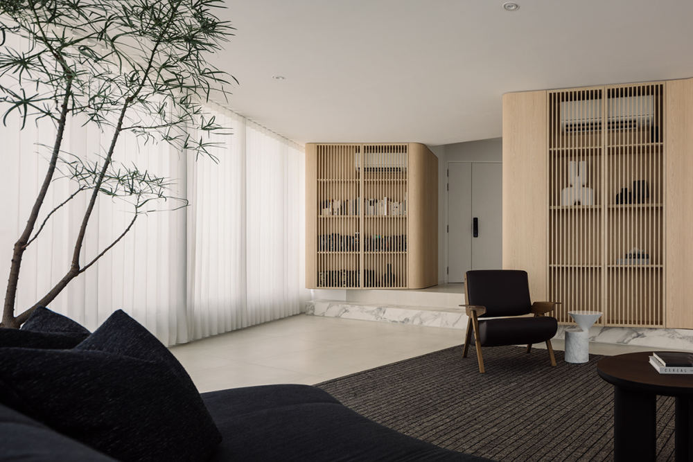 天然橡木飾面加上圓角角在這個(gè)空間內(nèi)帶來了一種更柔和的方法。我們巧妙地將壁燈放在入口附近,以便在回家時(shí)受到熱烈歡迎。環(huán)繞起居室的透明窗簾在該區(qū)域散發(fā)出柔和的自然光,讓人可以在這樣的寧靜中居住。這是通過移除現(xiàn)有的研究區(qū)域,讓充足的自然光涌入該空間來實(shí)現(xiàn)的。