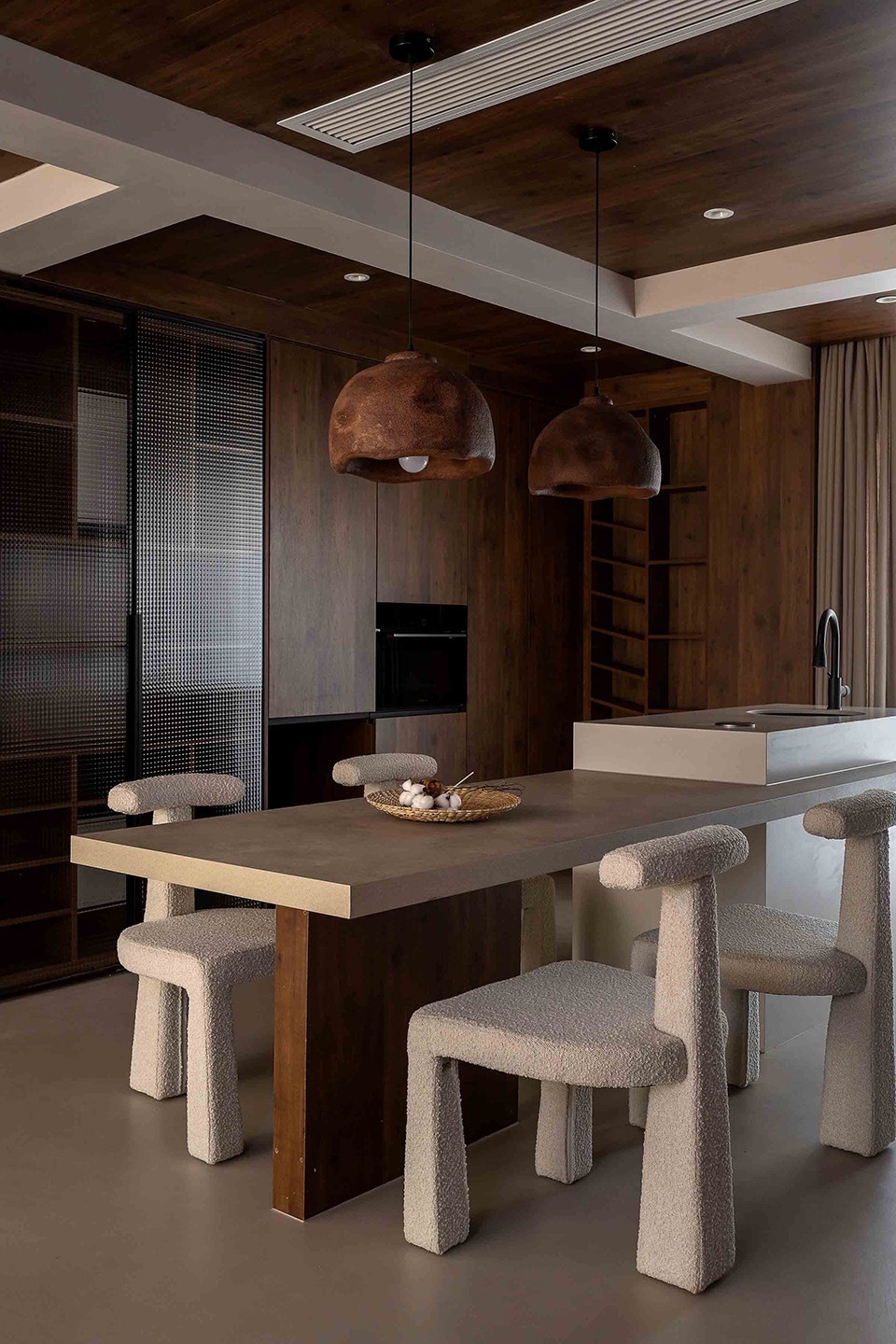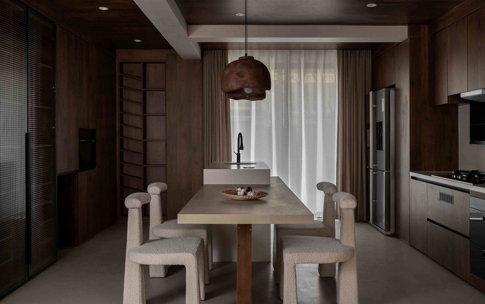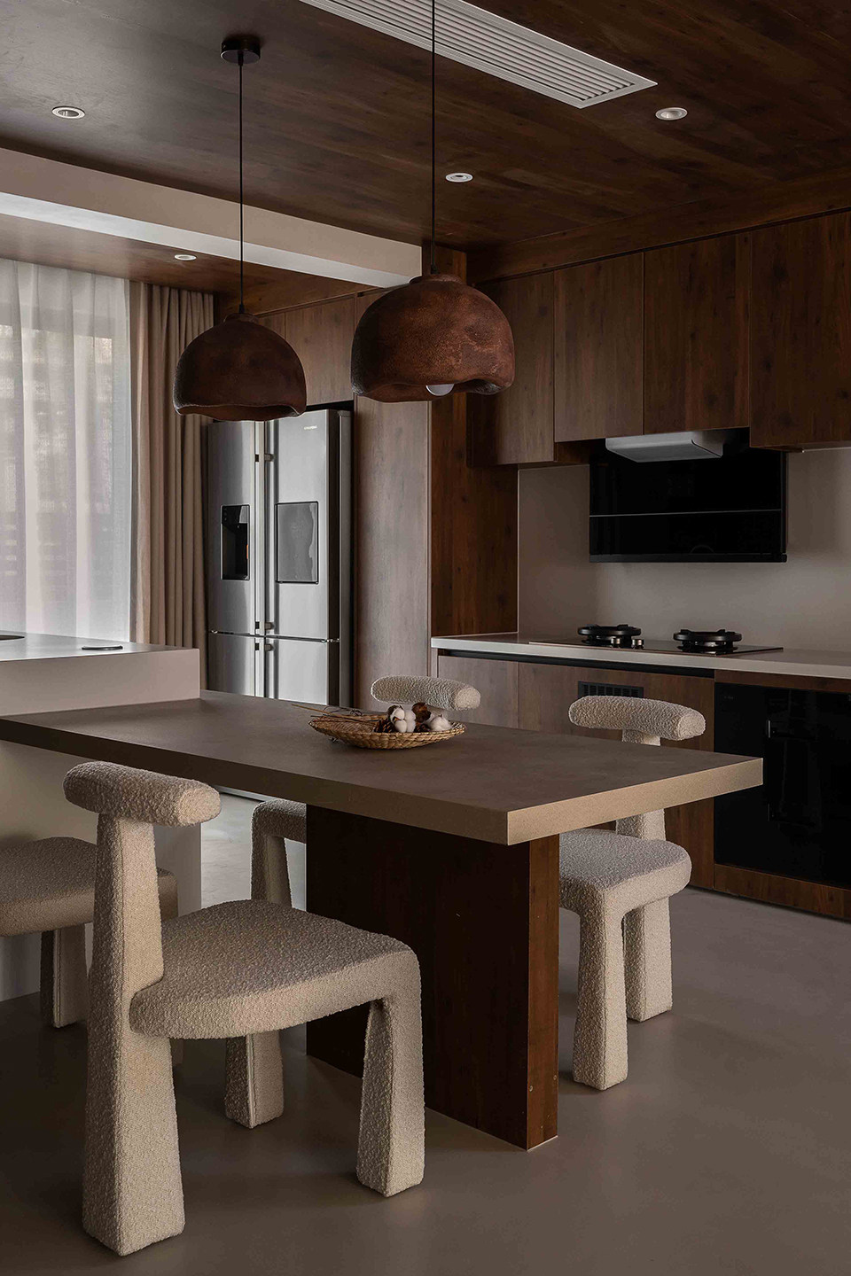 餐廚是最具煙火氣息的地方。中西廚的規(guī)劃,正符合屋主小云的心意 開放式廚房讓烹飪也變得有趣。廚房一面作為蒸烤與紅酒柜的西廚功能 一面作為清洗、烹炒的中廚功能。四人位餐廳營造就餐的儀式感,椰子殼餐燈獨具一格。