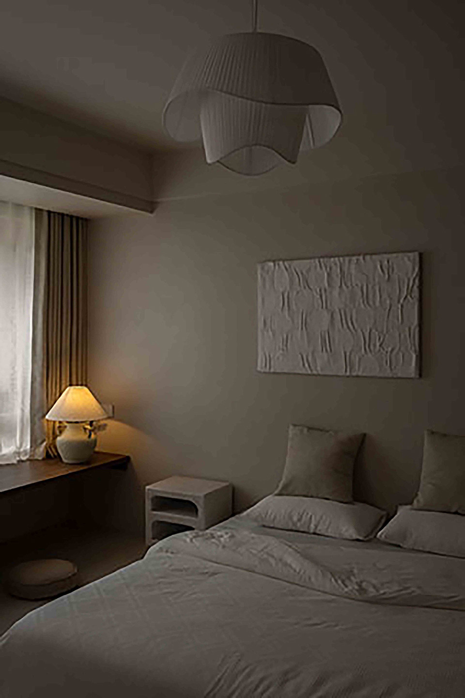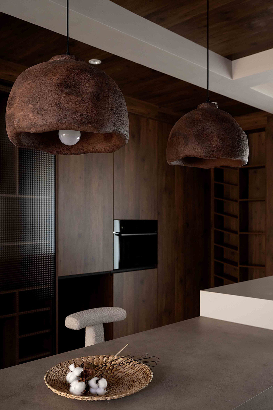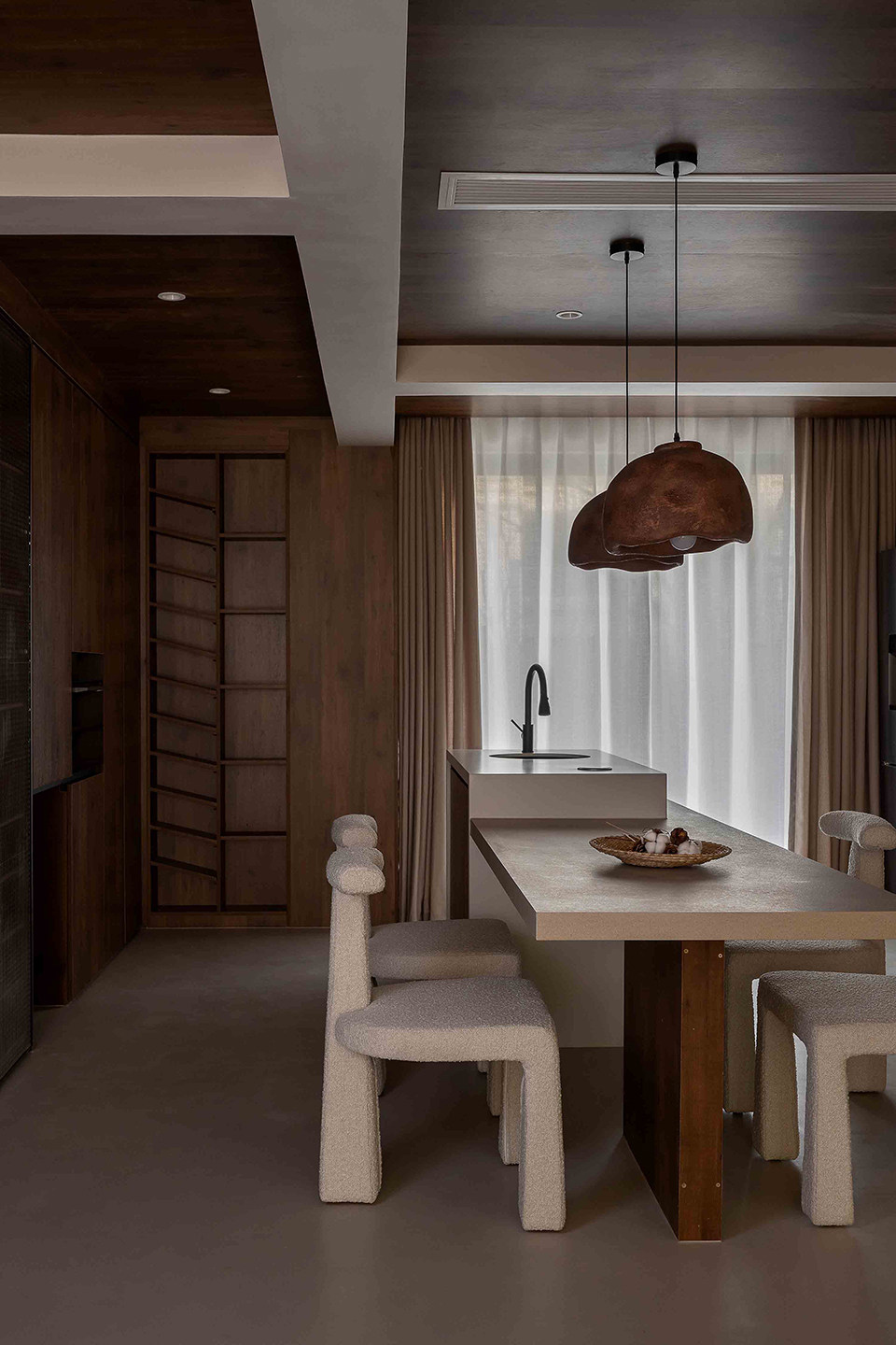 餐廚是最具煙火氣息的地方。中西廚的規(guī)劃,正符合屋主小云的心意 開放式廚房讓烹飪也變得有趣。廚房一面作為蒸烤與紅酒柜的西廚功能 一面作為清洗、烹炒的中廚功能。四人位餐廳營造就餐的儀式感,椰子殼餐燈獨具一格。