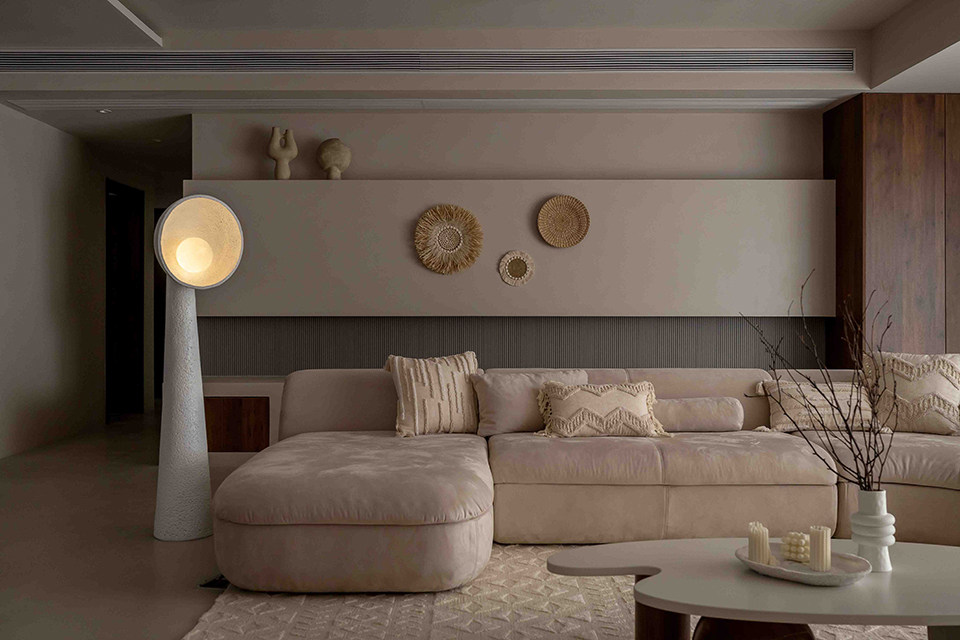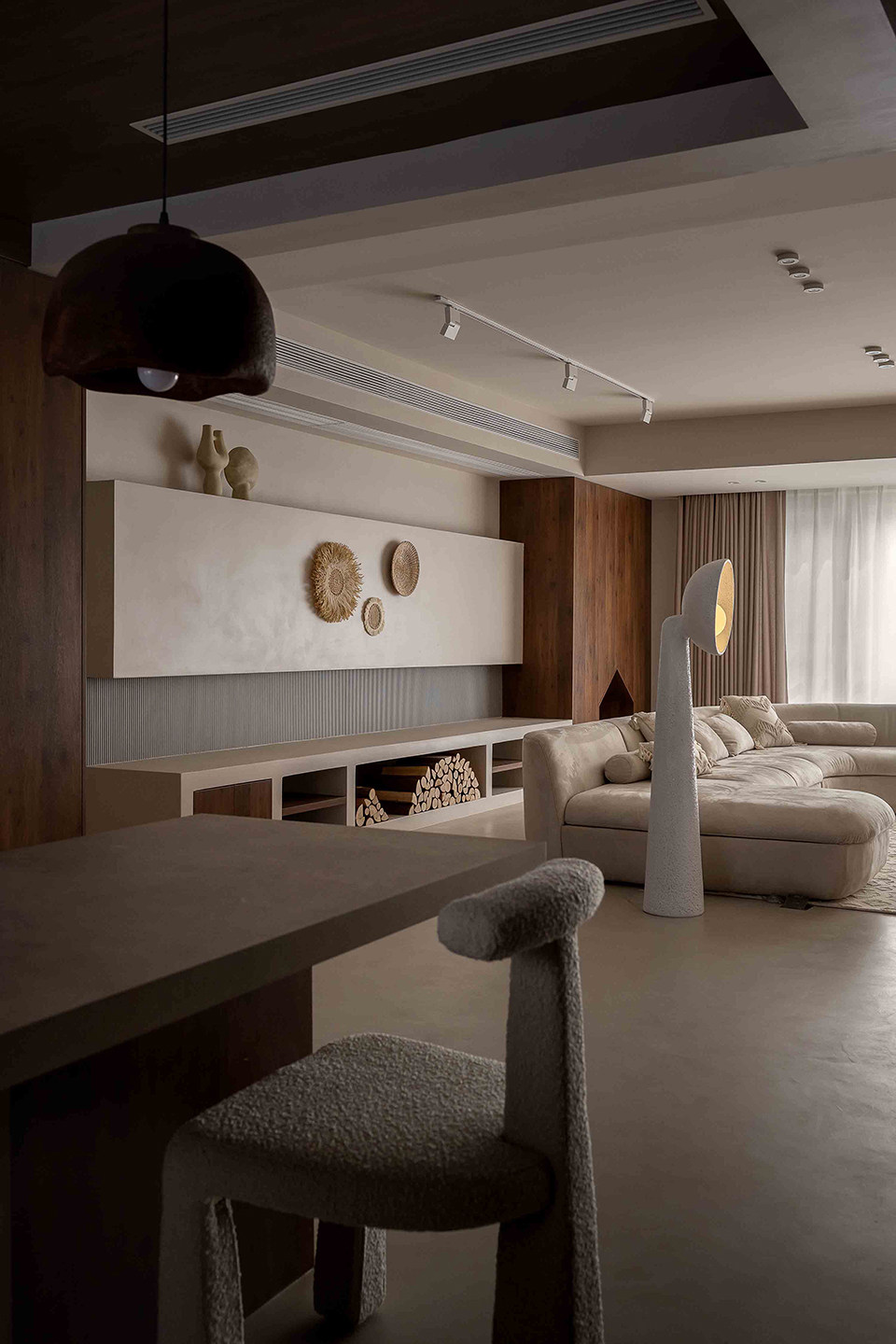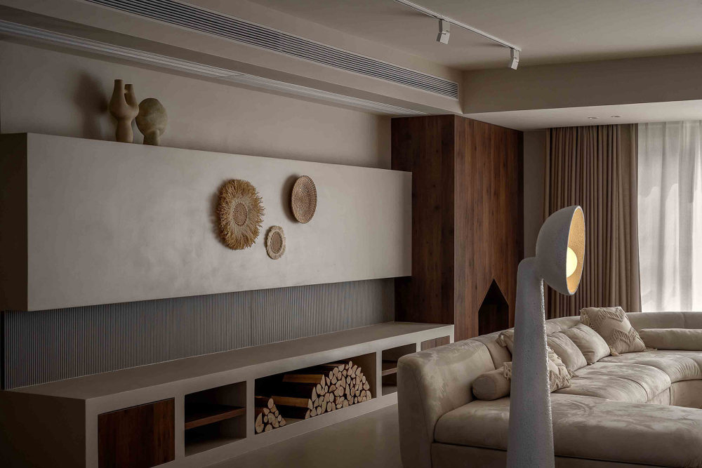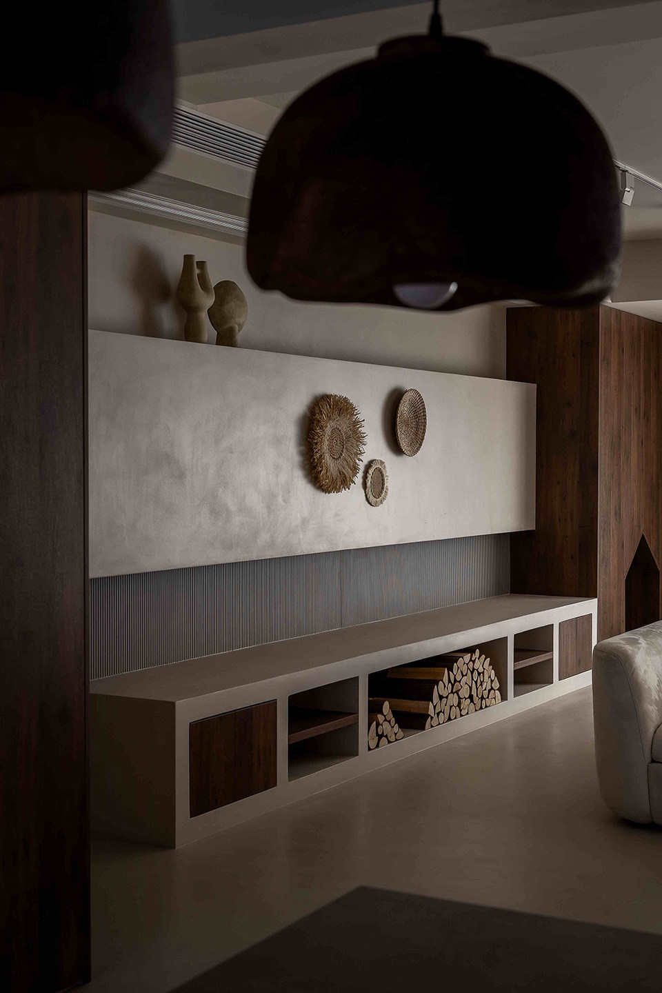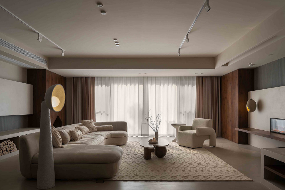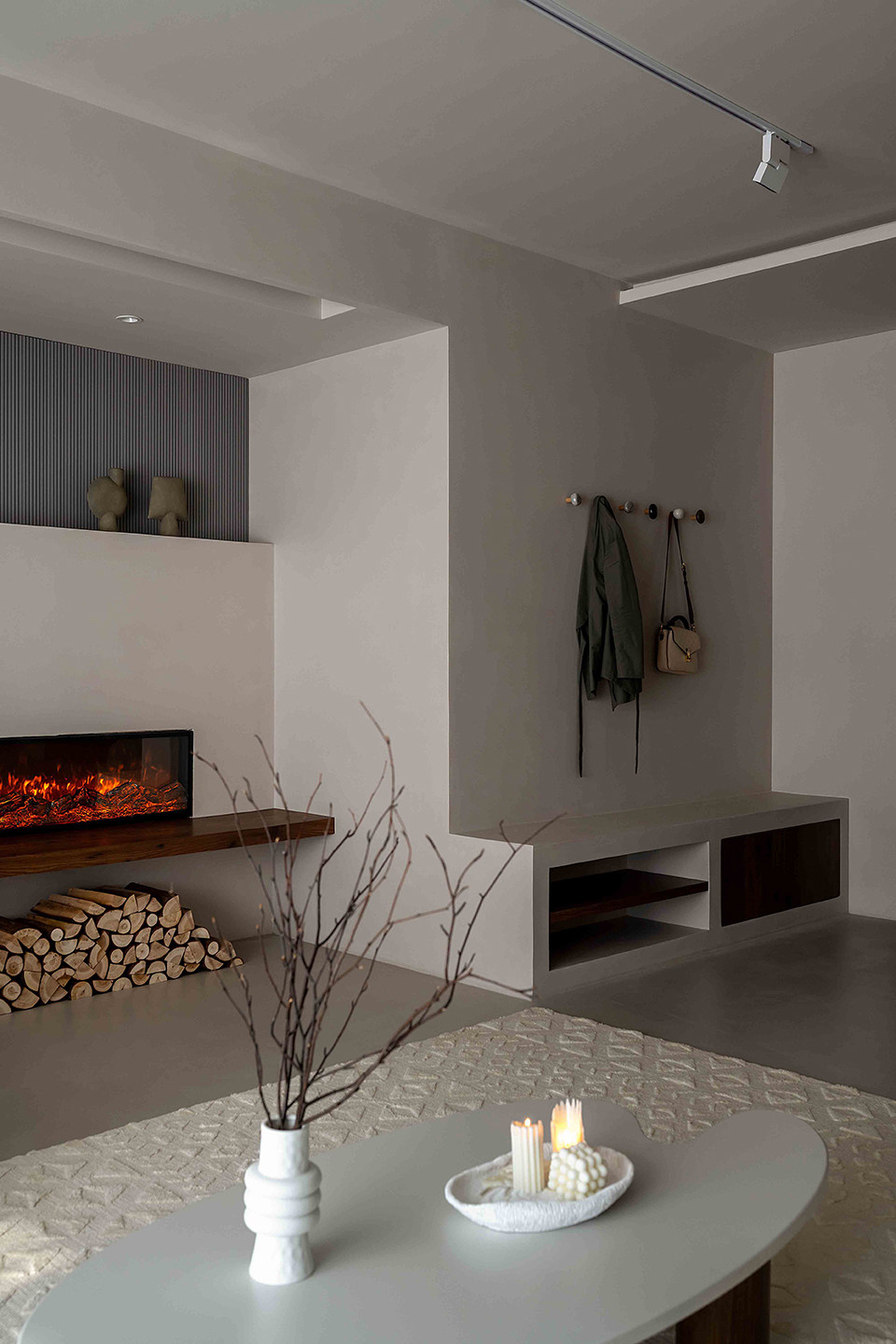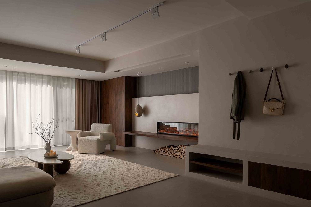 硬裝上:設(shè)計師采用全屋微水泥, 加上逼真的實木的板材來整體打造全屋格調(diào), 電子壁爐與木柴放在一起, 等著在秋冬來臨之際, 讓濕冷的重慶也顯得不那么寒冷。軟裝上,無需過多色彩,用淡雅從容的顏色即可。不必過于復(fù)雜的線條元素以大地、草木、云朵色系為主,家具選擇布藝,樸實而親切。