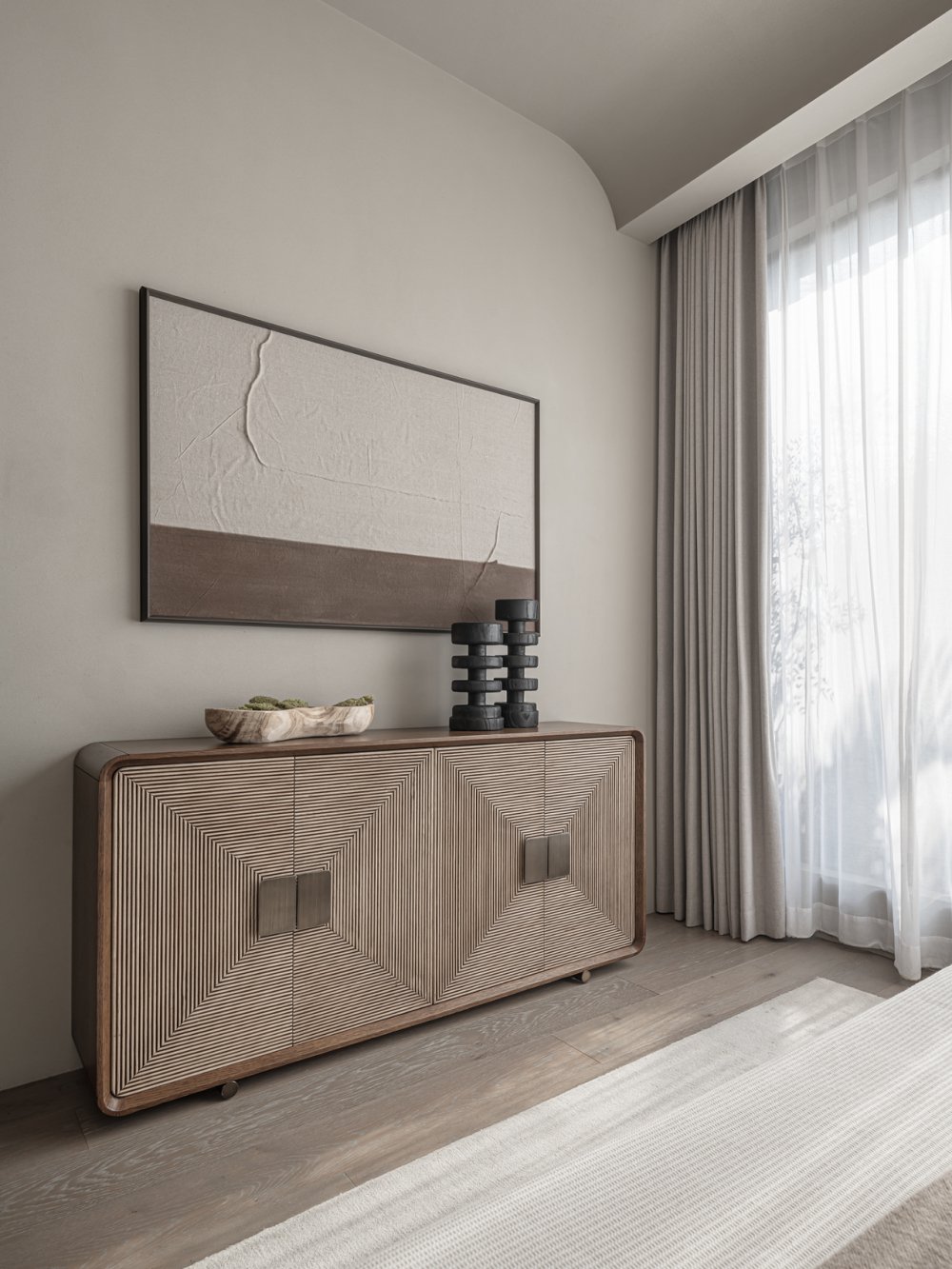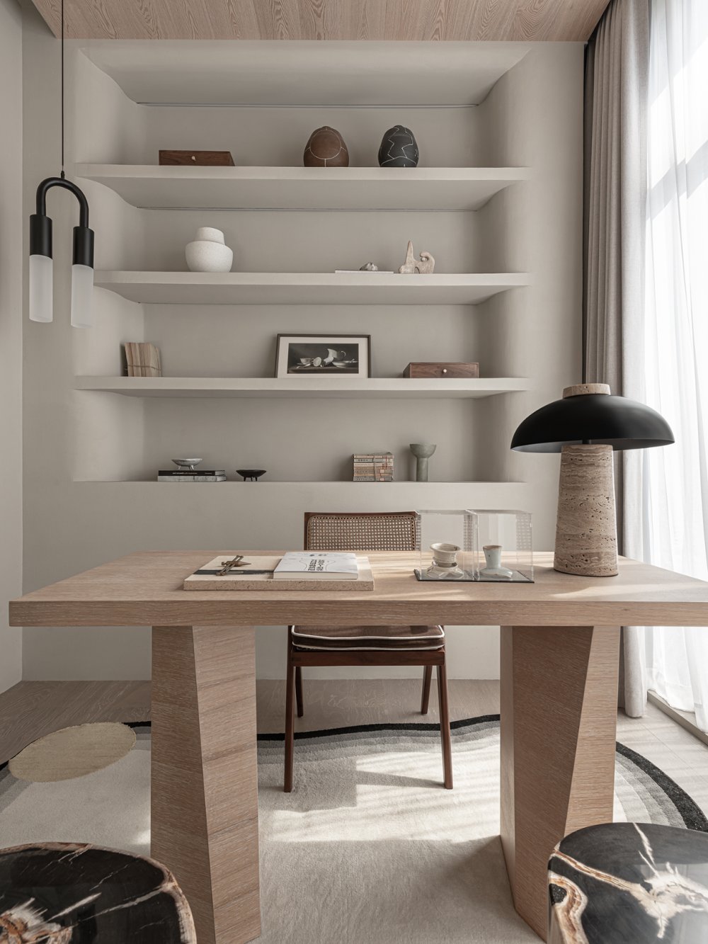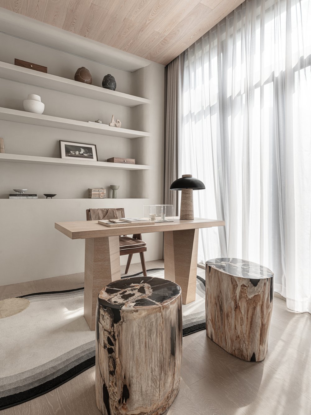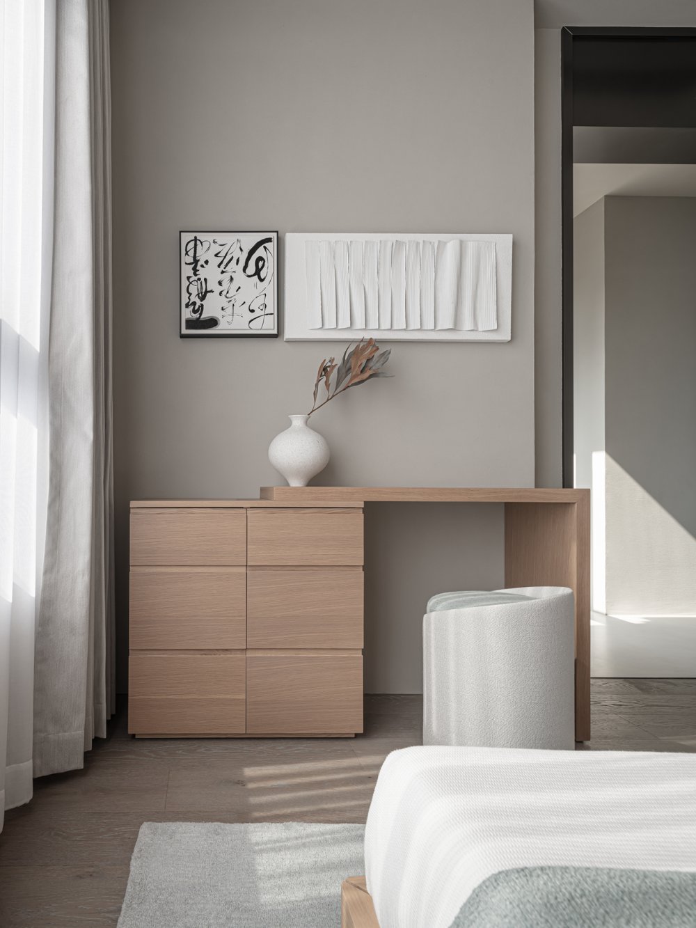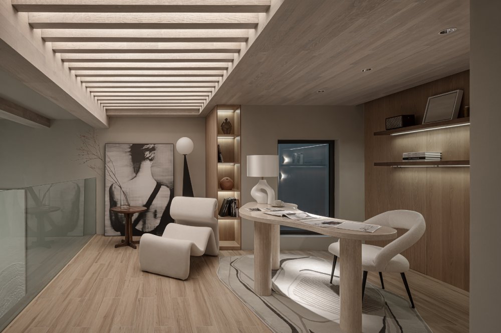 一縷柔和光線或疏松淡雅的色調(diào),細(xì)膩溫潤(rùn)地應(yīng)和著材料紋理所帶來(lái)的厚重感。無(wú)數(shù)細(xì)節(jié)在矛盾中交融,如同生活的回響。