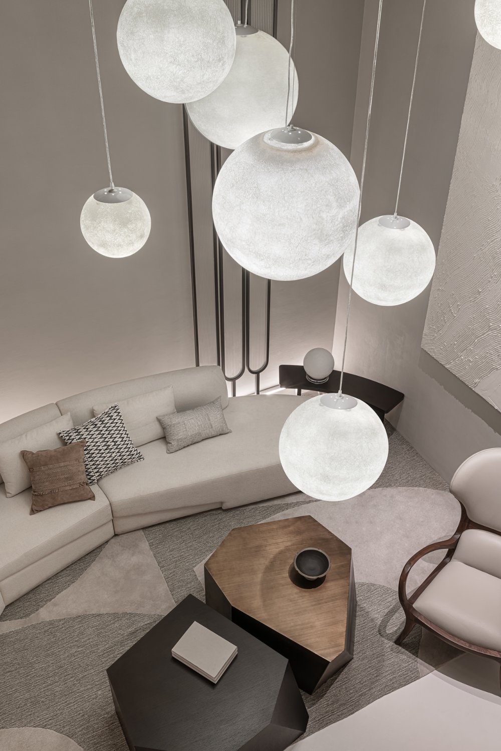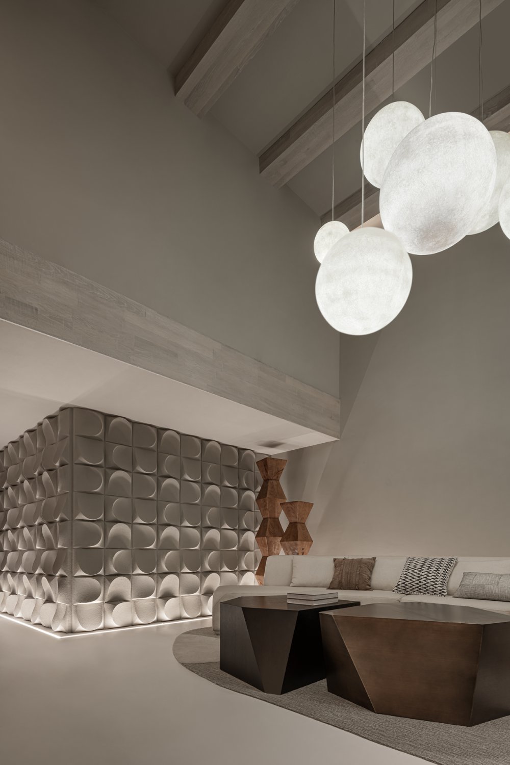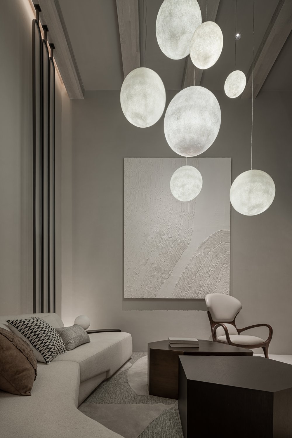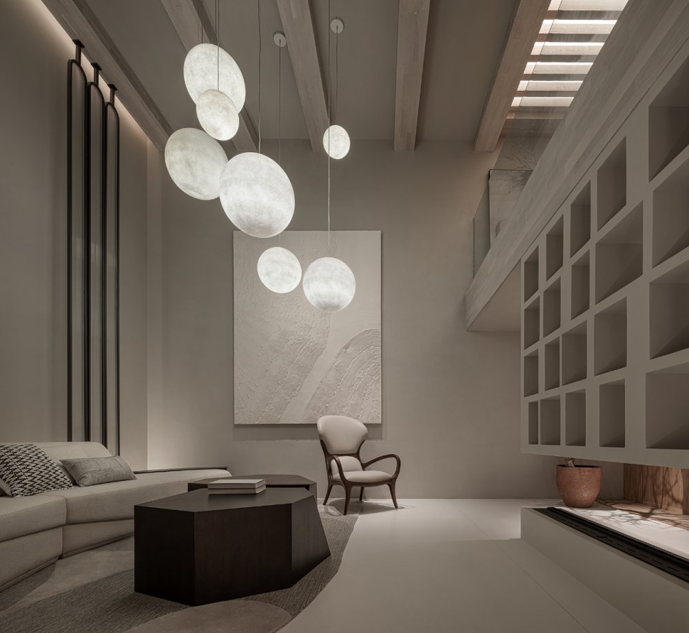 燈具如氣泡或月光,輕輕盈盈,中和了原有的厚重與沉靜,在上下兩層空間內(nèi)伸展貫通。