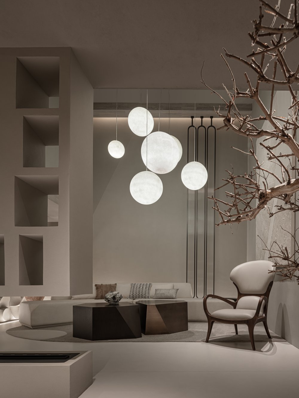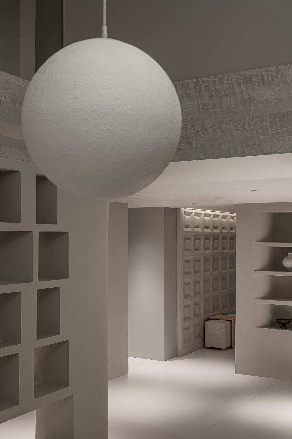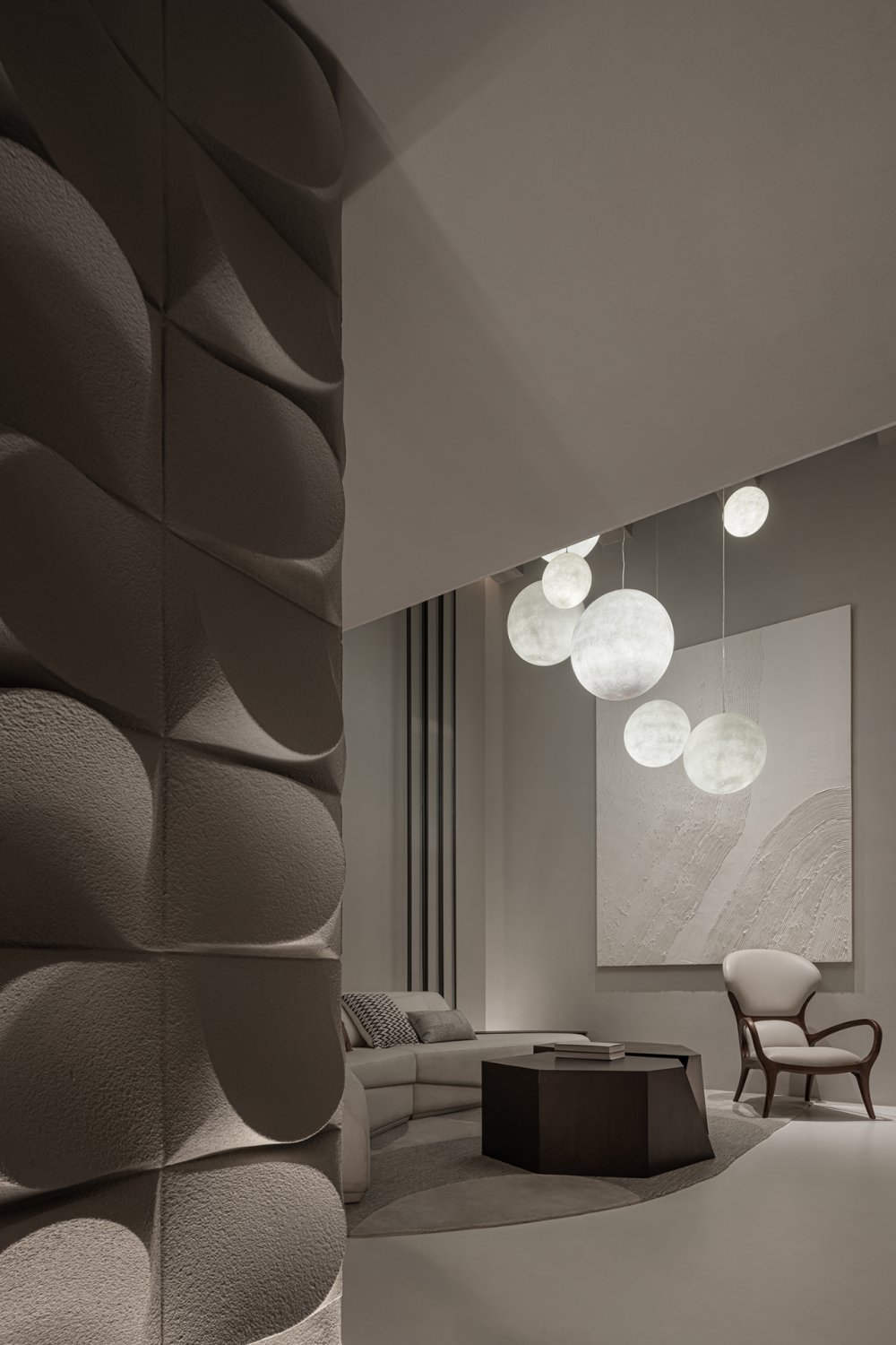 燈具如氣泡或月光,輕輕盈盈,中和了原有的厚重與沉靜,在上下兩層空間內(nèi)伸展貫通。