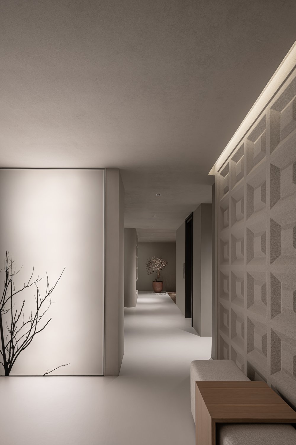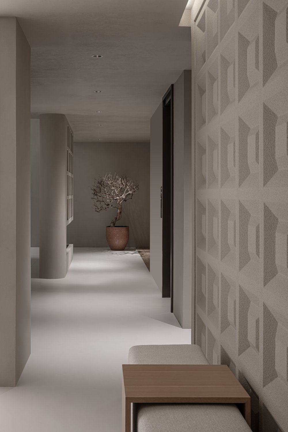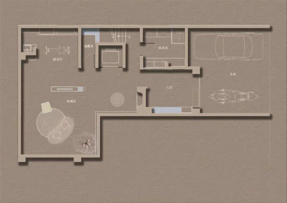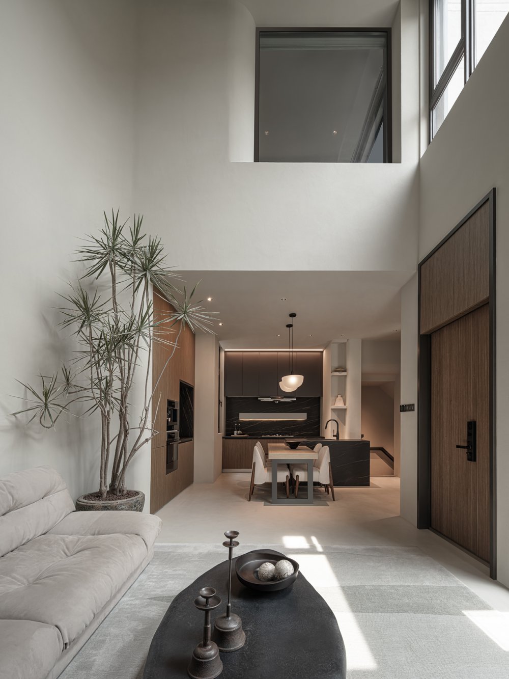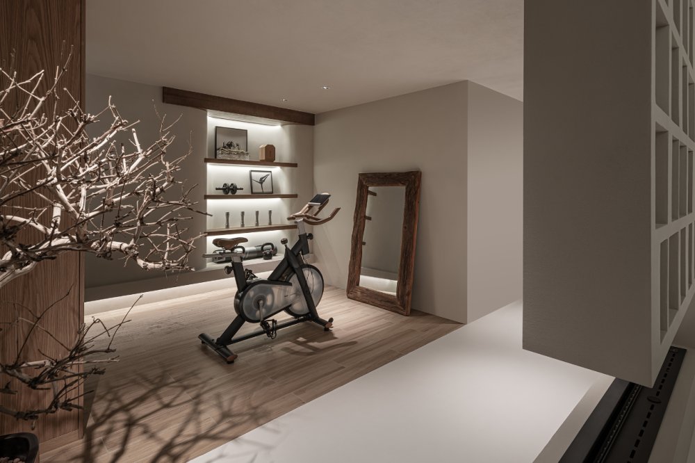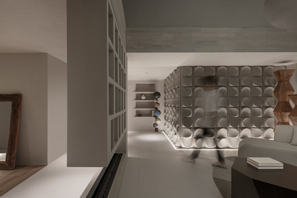 幾何體塊的節(jié)奏感之間,沙丘美學(xué)式的粗糲質(zhì)感與質(zhì)樸色彩,以光影為媒介,為畫(huà)面增添厚度。不規(guī)則鏤空玄關(guān),在安全感與通透性之間尋求平衡。
