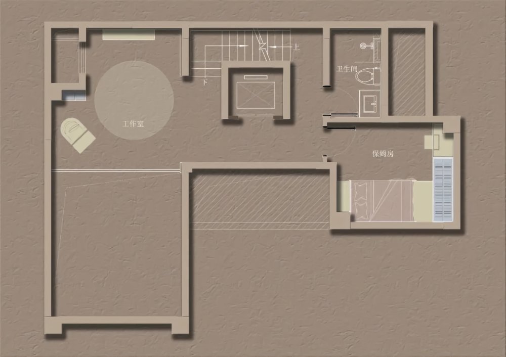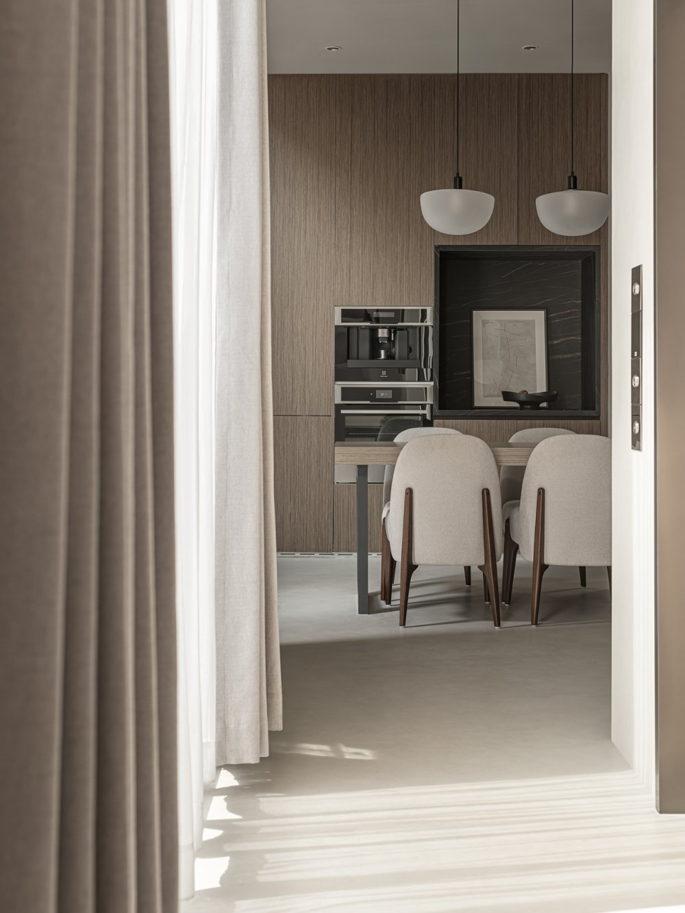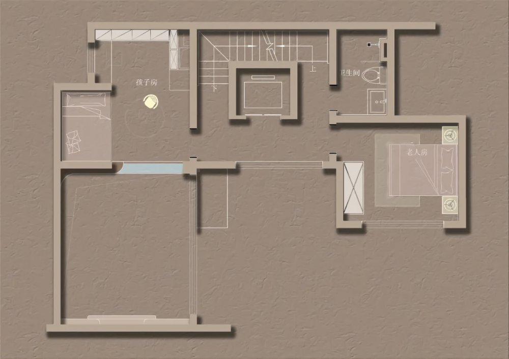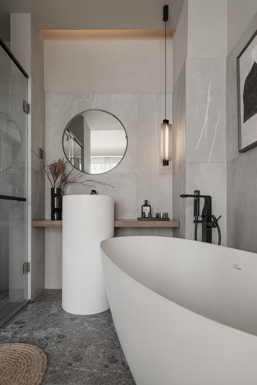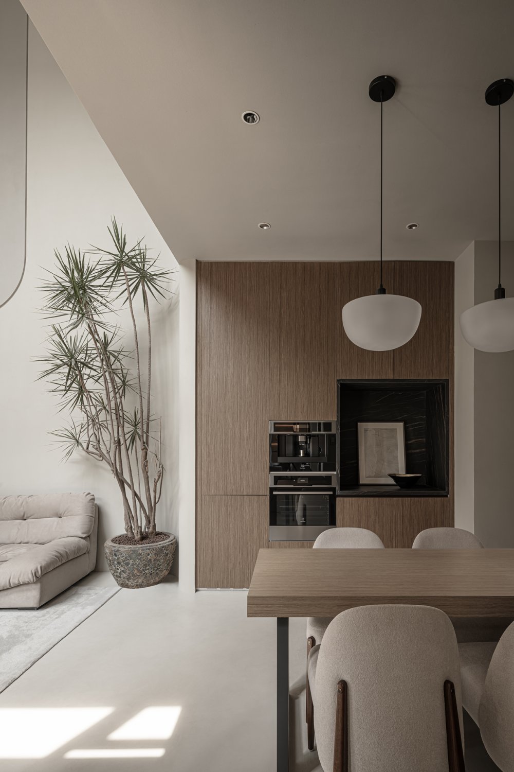 幾何體塊的節(jié)奏感之間,沙丘美學(xué)式的粗糲質(zhì)感與質(zhì)樸色彩,以光影為媒介,為畫(huà)面增添厚度。不規(guī)則鏤空玄關(guān),在安全感與通透性之間尋求平衡。