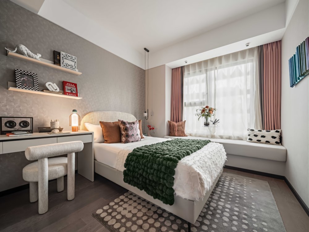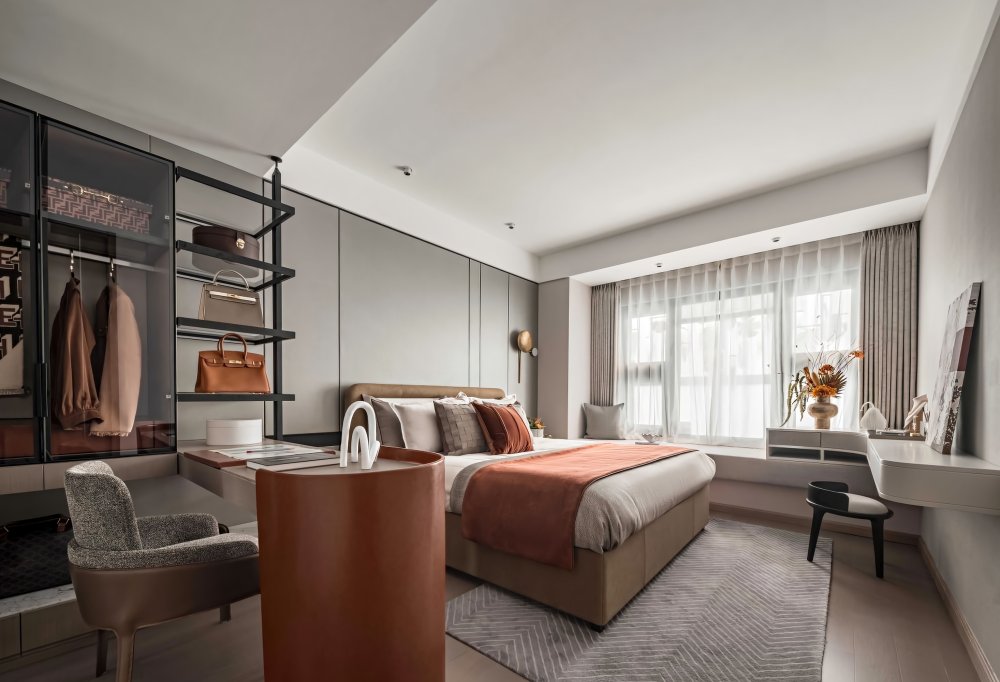 隨著空間動(dòng)線步入主臥,才算是進(jìn)到空間敘事的高潮。衣帽間與梳妝臺(tái)貫通在一條視覺線上,全透明的飄窗予以空間溫柔的自然光線。