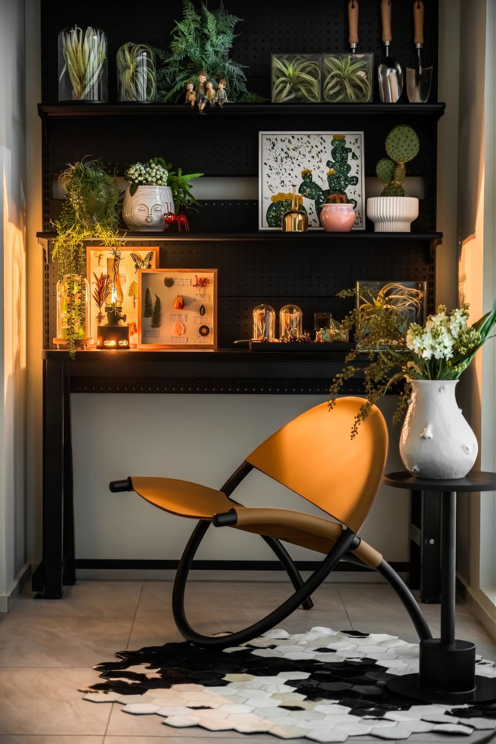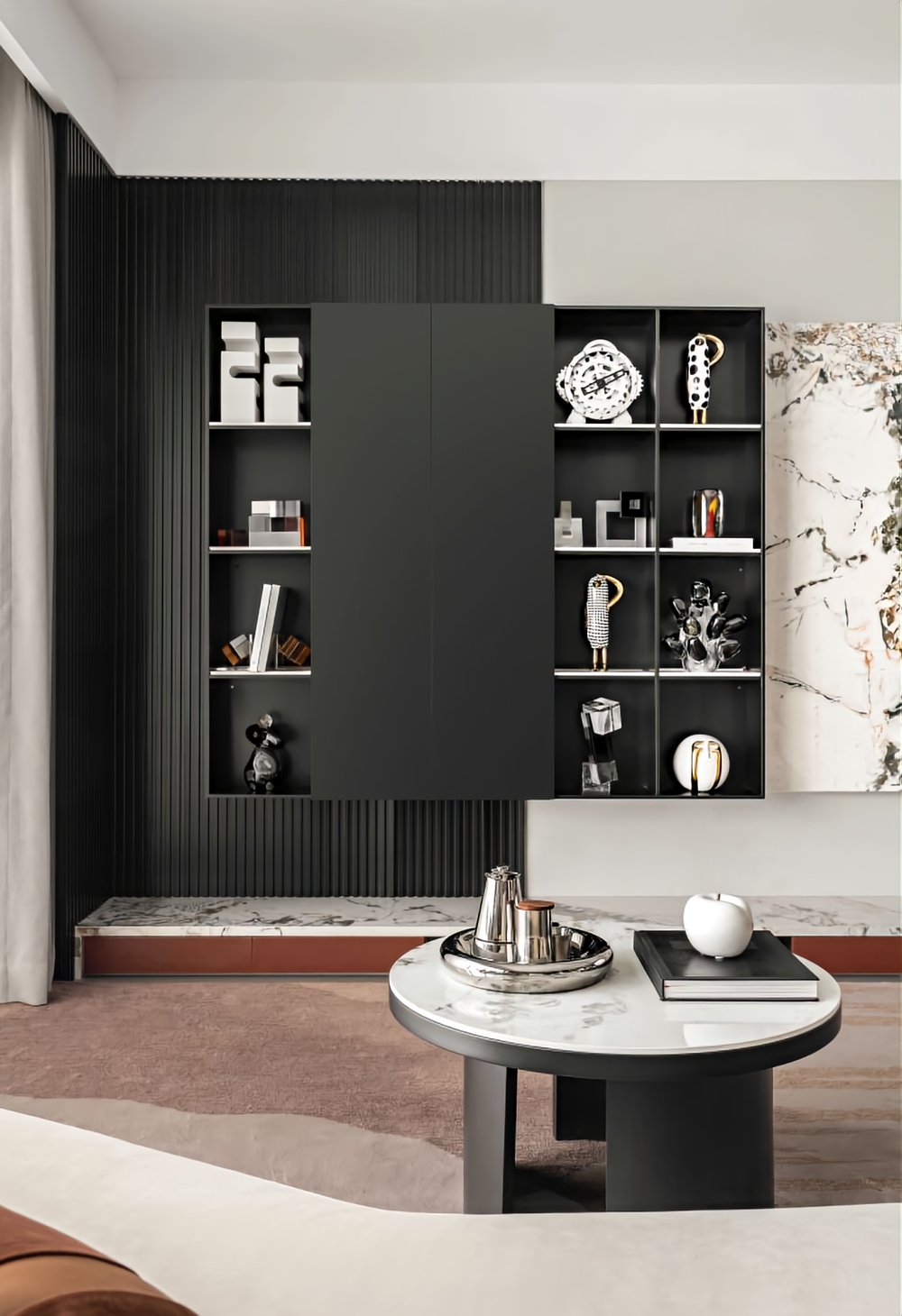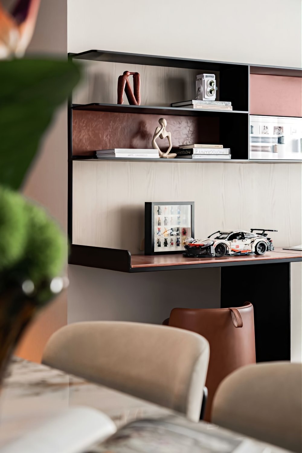 以現(xiàn)代主義去融合江南文人的含蓄與靜默,書房中以大面積陳列架衡量空間尺度,突破傳統(tǒng)書房的采光樣貌,搭配落地飄窗,引入自然光以慰藉內(nèi)心的精神世界。
