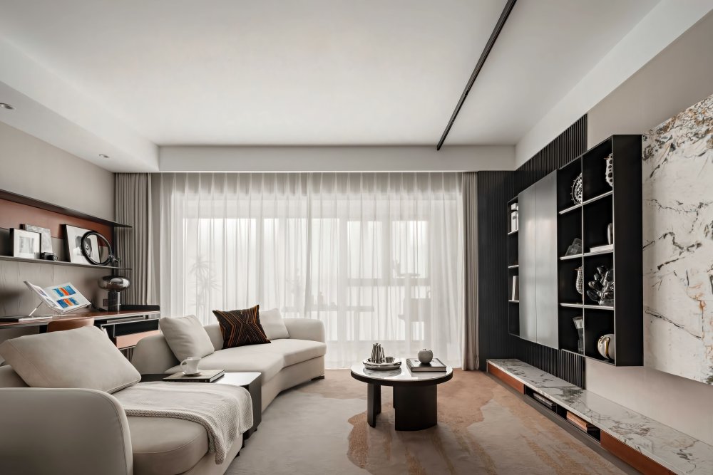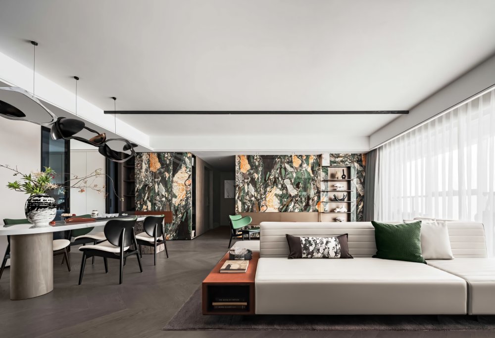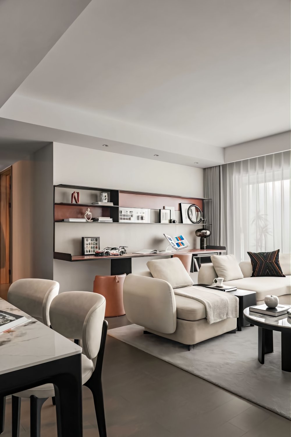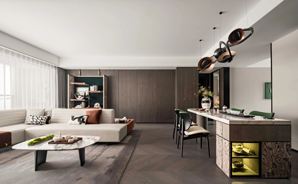 客廳根據(jù)光亮的材料和建筑線條再定義,大理石島臺(tái)與墻面不規(guī)則紋理塑造感性家居形式,從喧囂的城市中抽離,營造舒適、私密且平靜的居住空間。