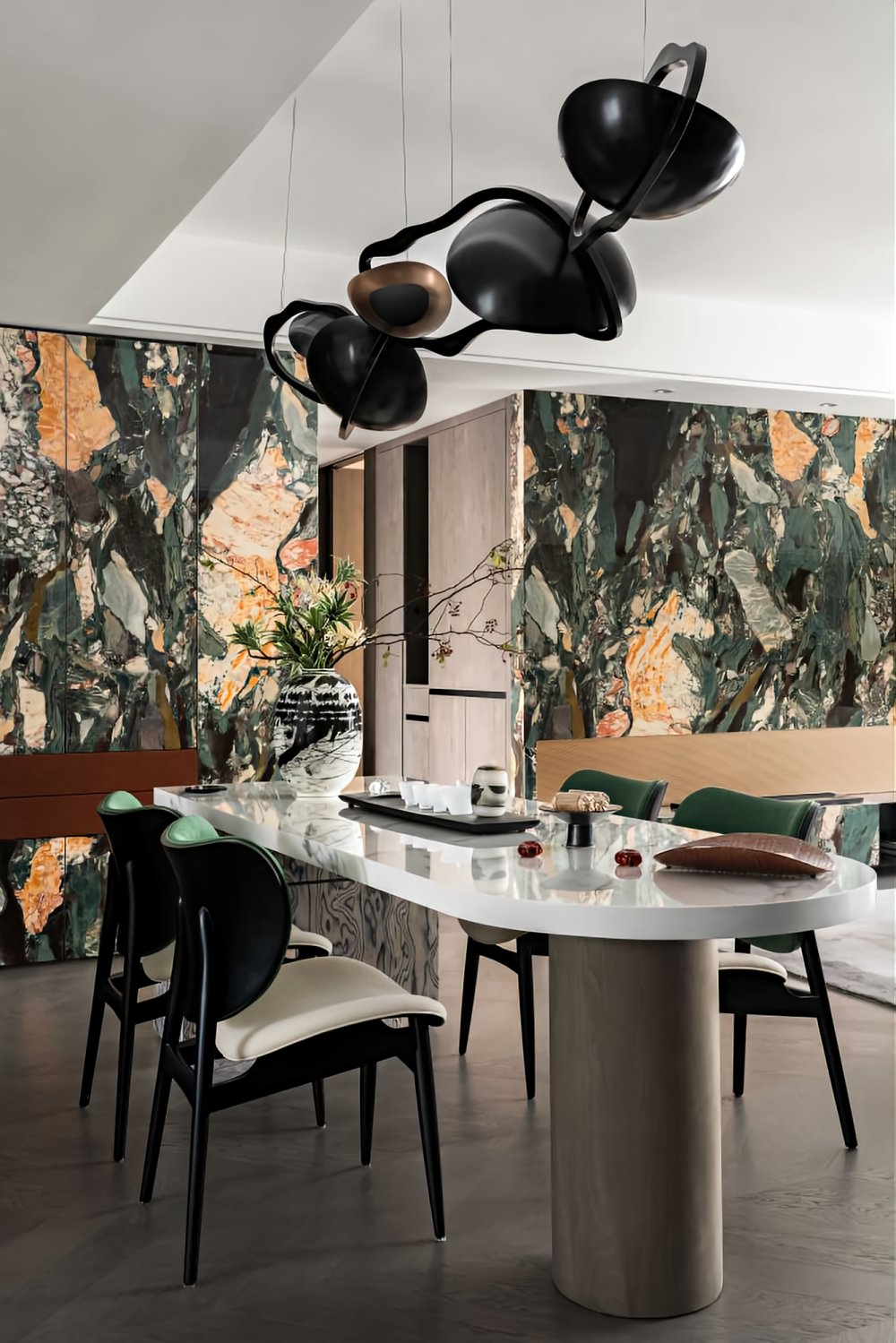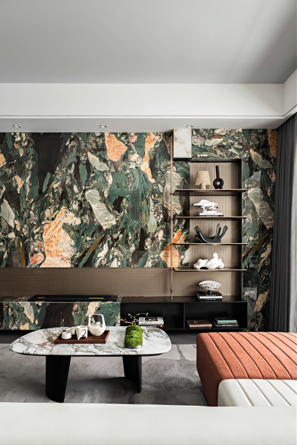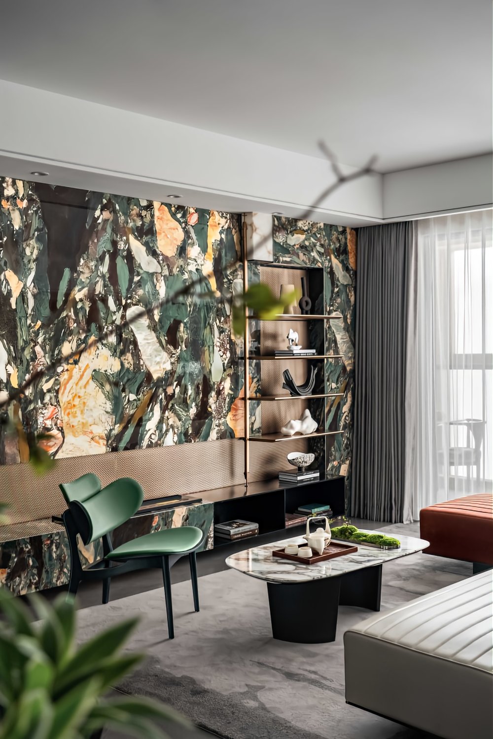 透過色彩的轉(zhuǎn)換定義空間不同主題的情緒表現(xiàn),原始森林般的大理石墻面帶來自然特色,開放式的空間架構(gòu)透過型態(tài)的切割,創(chuàng)造出不同框架式戶型上的空間效果。