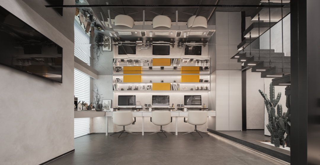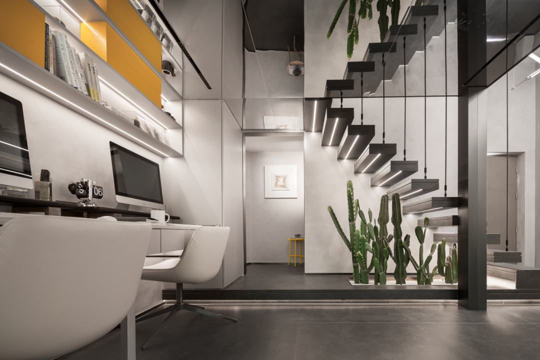 打破傳統(tǒng)的空間界限,開放辦公區(qū)方便互相交流,鮮活的社交氣息,使空間氛圍變得親近而有趣。盡頭處意大利藝術(shù)家Biasi的作品《門》以虛擬運(yùn)動(dòng)學(xué)的概念呼應(yīng)Robot的主題。