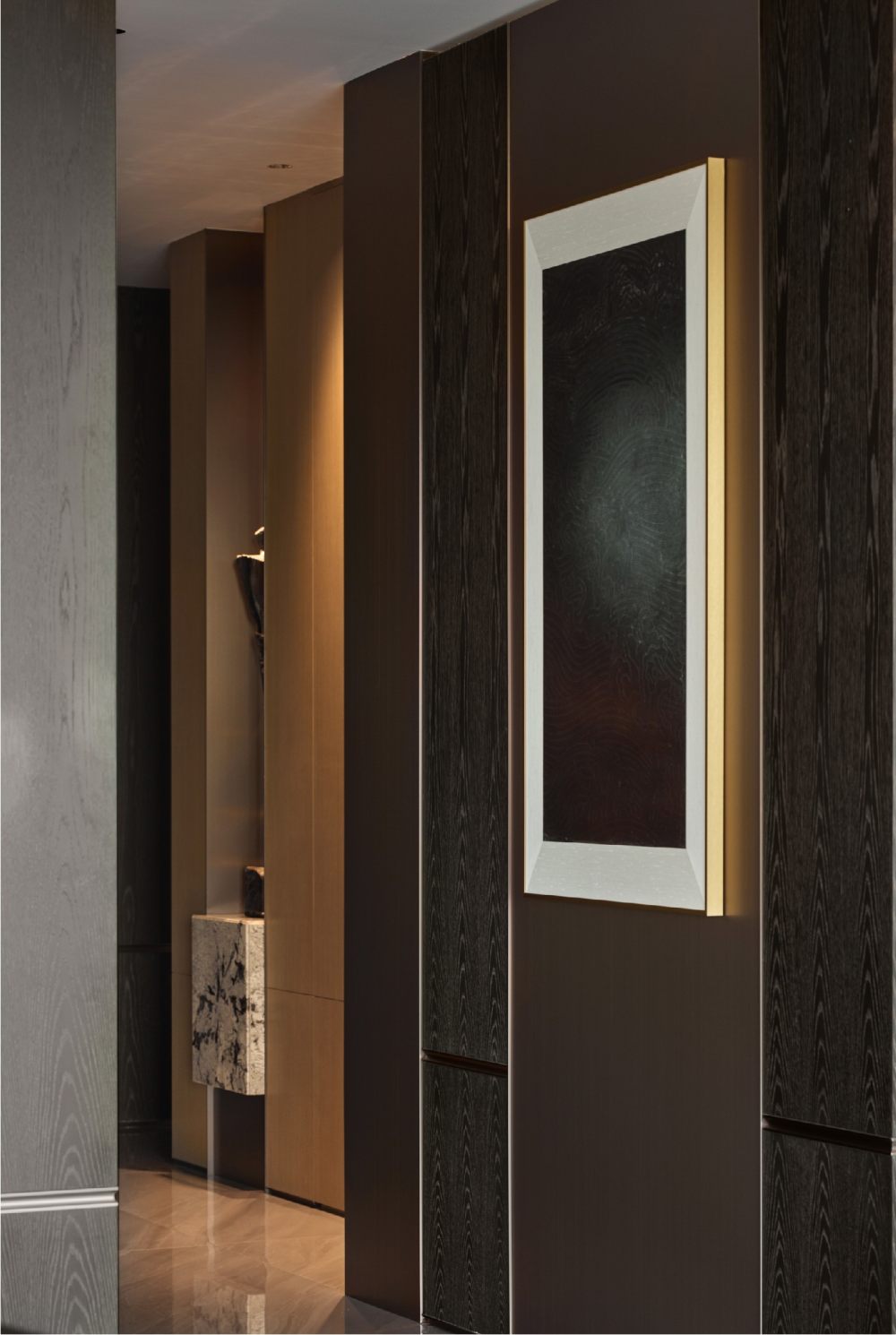 飽含漸變美感的輪廓,激活了深淺木色的細膩感,與詩意盆景相鄰,碰撞出人文與自然共通的美學意境,從初始階段便注入了別樣的生活情趣。嵌入自然奢石,以簡約配色凸顯藝術(shù)氣質(zhì),定義了空間深層的審美與涵養(yǎng)。