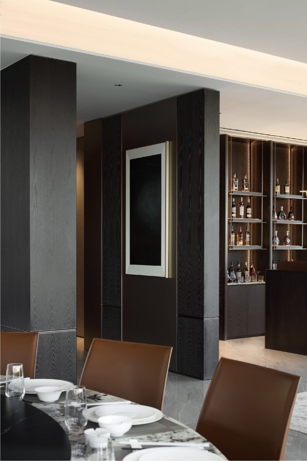 依據(jù)架構(gòu)特征,采用幾何分隔手法確立空間,以深調(diào)為主,透過相異材質(zhì)對光的折射度,展現(xiàn)品藏環(huán)境的美學意義。置入暗色隔斷,制造朦朧雅致的視覺形象,衍生出與整體氛圍和諧共生的藝術(shù)張力。