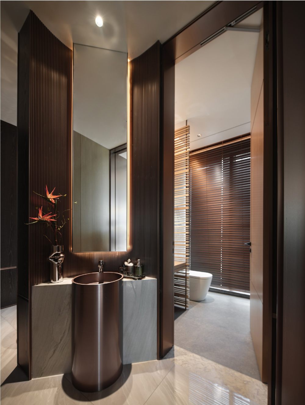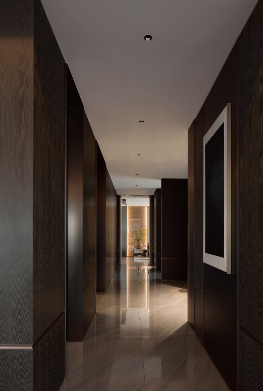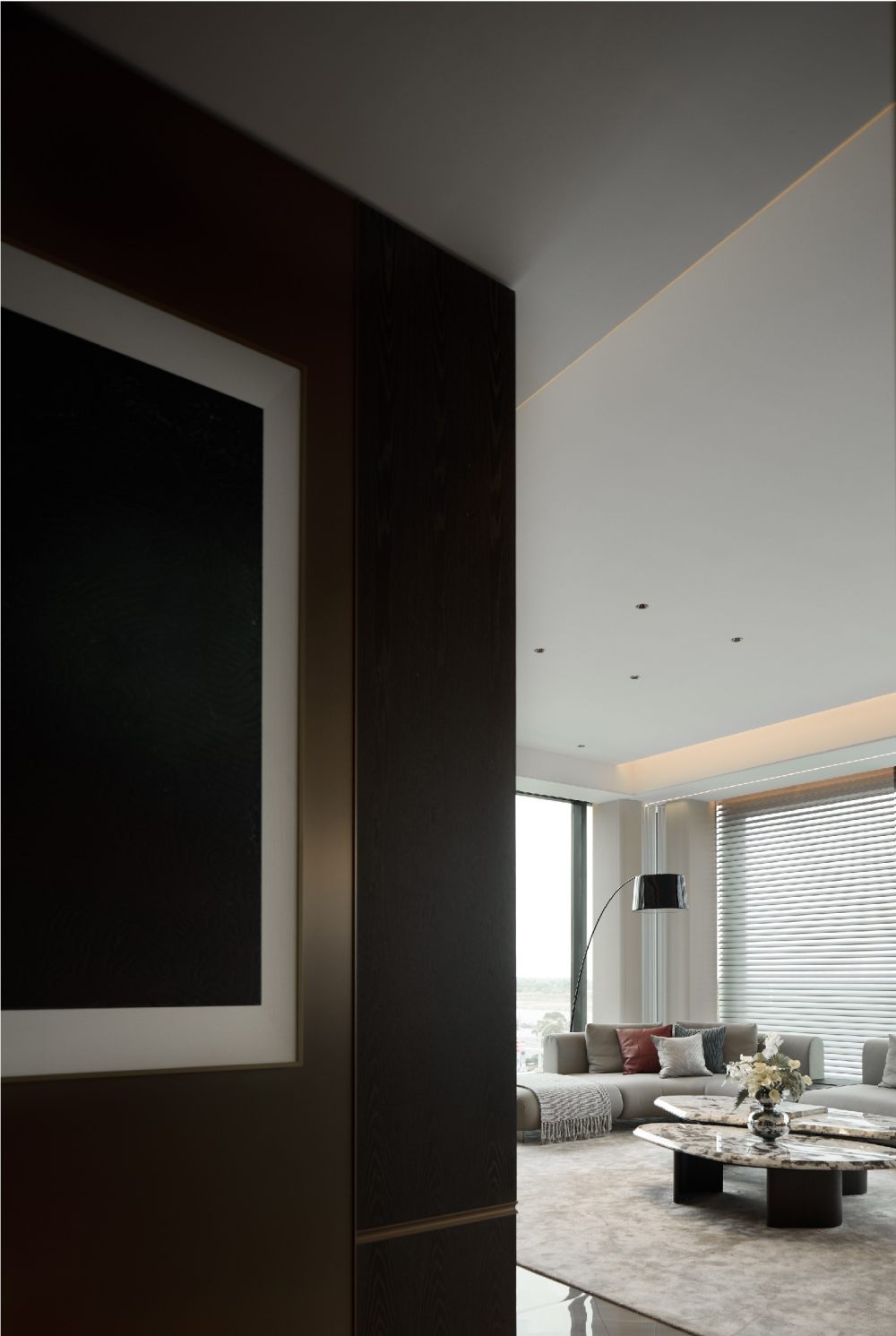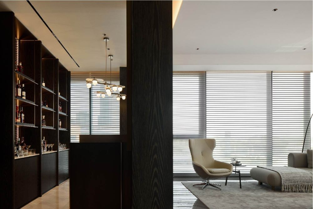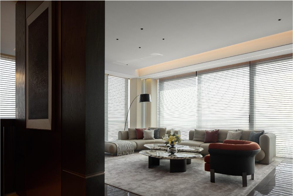 百葉簾將光的語素打破重組,展露出和諧柔暖的氣質(zhì),輔以線性光強調(diào)飾面奢感,從上至下地增加色彩的溫度,同時甄選灰色調(diào)陳設(shè),通過錯落形態(tài)創(chuàng)造新的意趣,經(jīng)由色彩碰撞傾訴溫馨氛圍。