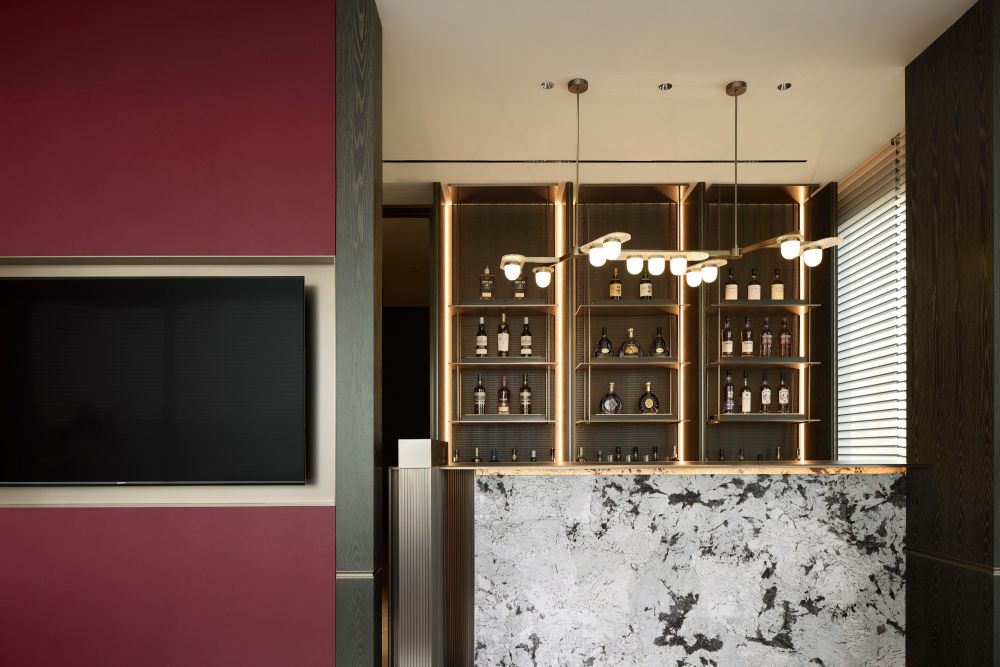 沿用金色材質(zhì),書寫隔層韻律和體塊層次,釋放出暗色蘊含的慵懶感、神秘感與高雅感,兩人并排小坐,一邊欣賞窗外精美景致,一邊沉浸于微醺狀態(tài),達成了放空思緒、感知美好的需求。