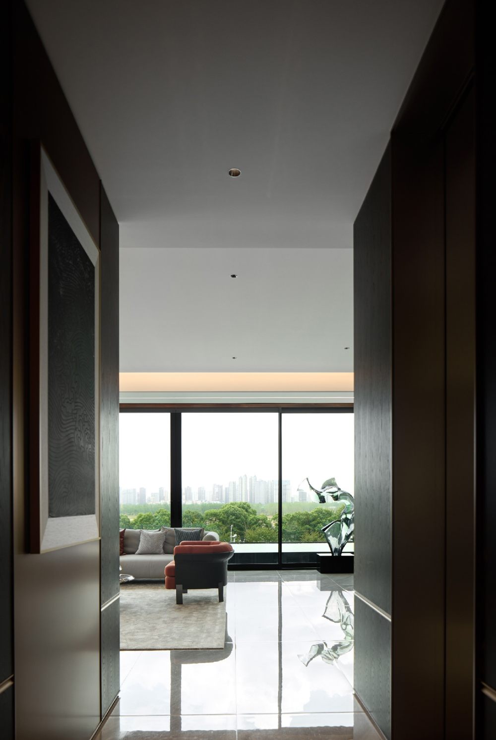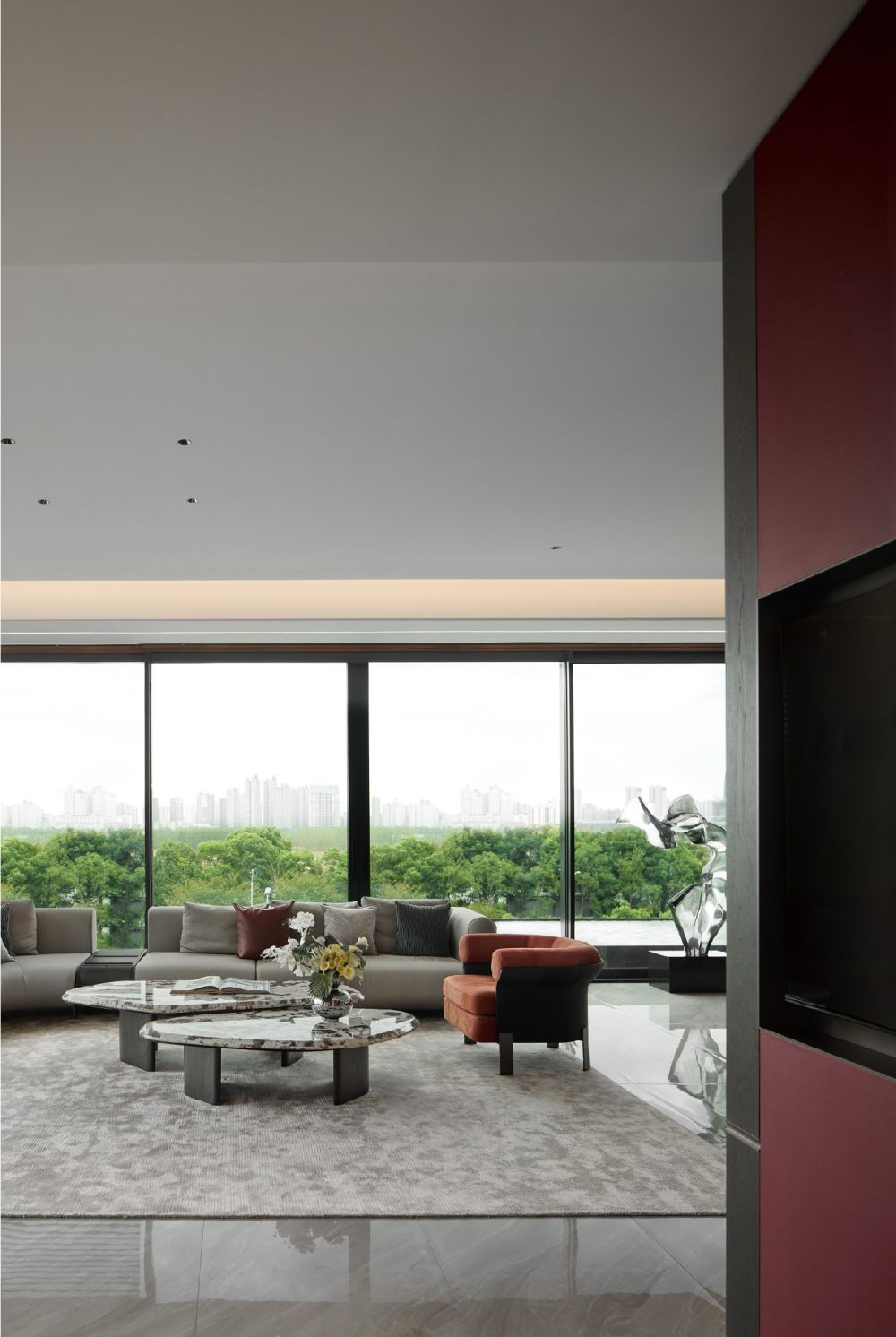 落地窗的絕對魅力在于它的真實性,每時每刻呈現(xiàn)著窗外限定的城市美景與自然景致。地面映射著日暮轉(zhuǎn)換的情態(tài),攜自然紋理對話織物的高級簡美,將大氣雋永、華光沁人的余韻擴展至窗外,繪就新的生活場景。甄選造型感強、柔美端莊的灰調(diào)沙發(fā),點綴赭石色單椅,悄然過渡了場域的交界。