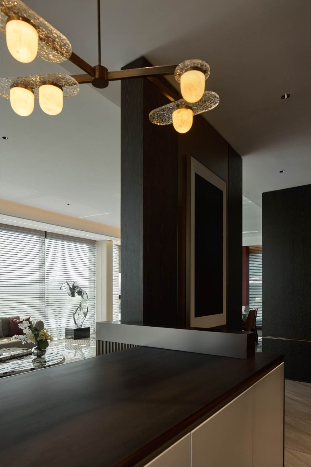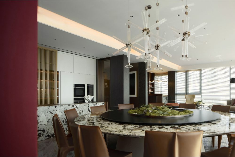 格柵以均衡的圖紋排列,既細化了場域功能,又重塑出另一重美感。更具藝術(shù)力的大理石元素,讓設(shè)計產(chǎn)生了隔空呼應(yīng)的趣味,并以不同切面帶給觀者不同感受,讓自然氣息與煙火氣交織。